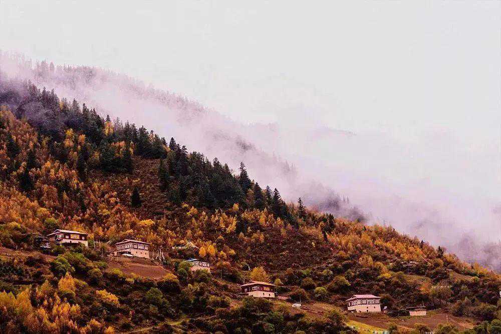 可以看到对面山腰红色崩空式的藏式木屋