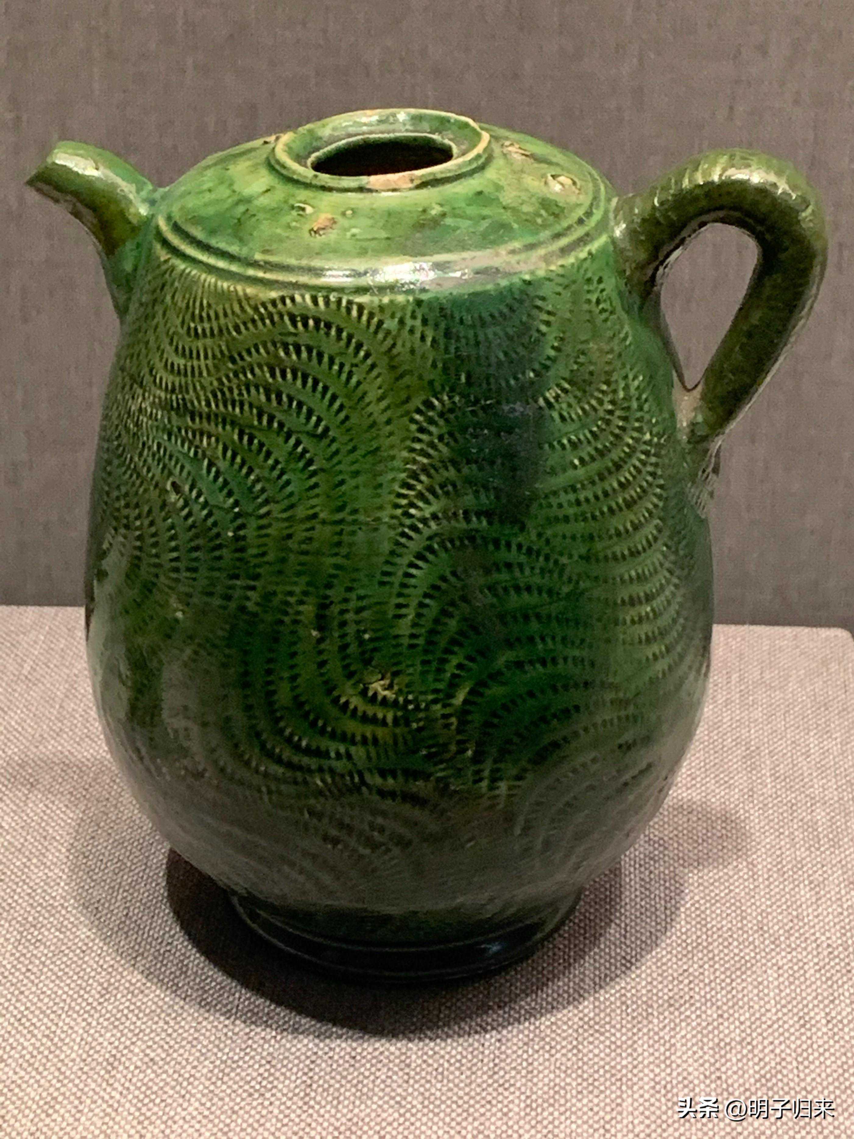 辽绿釉单孔鸡冠壶(皮囊形为契丹经典造型之一)