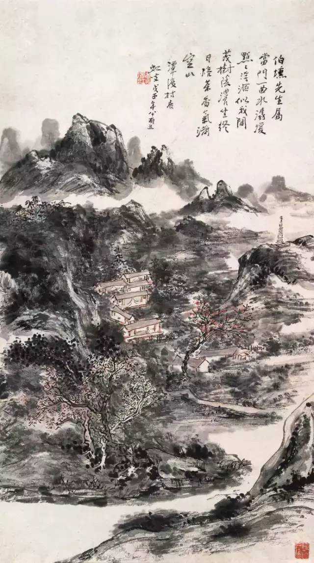 在北平的十一年,黄宾虹完成“黑宾虹”的转变后,又进行“水墨丹青合体”的试验。用点染法将石色的朱砂、石青、石绿厚厚地点染到黑密的水墨之中,“丹青隐墨,墨隐丹青”,这是受西方印象派启发,思以将中国山水画两大体系(水墨与青绿)进行融合的一大创举。
