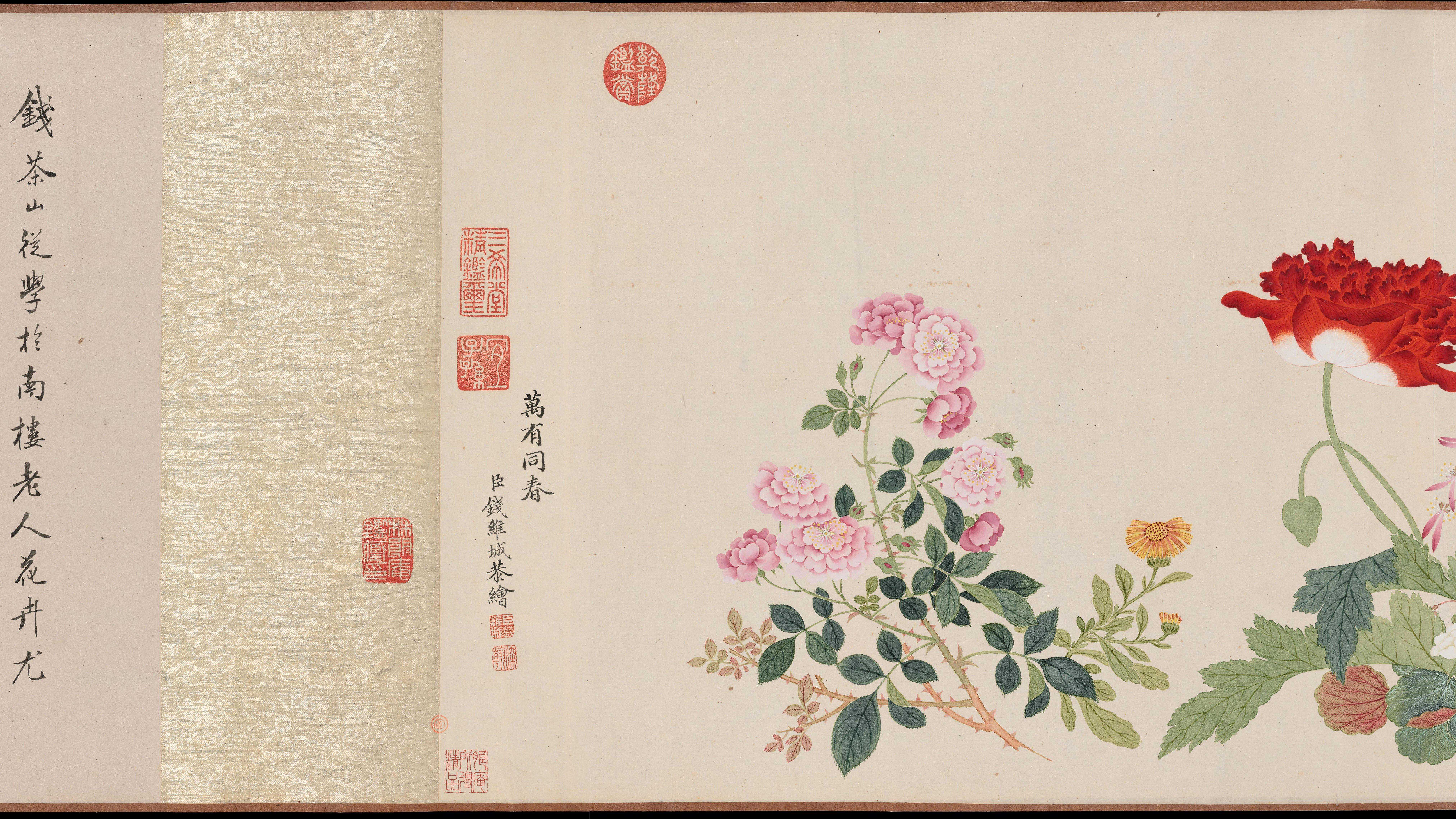 此图卷由清代画家钱维城绘制。画卷以折枝的方法将生长于不同时节的几十种花卉,密密匝匝地按大小依次穿插,整齐地排列在画面中。以没骨法绘写花叶、花瓣,形态逼真。钱氏画风以干笔勾勒,重视烘染,笔墨浑然,用笔缜密,以青绿、赭石相间设色,极富宫廷富贵气息。此卷现藏于美国波士顿美术馆。
