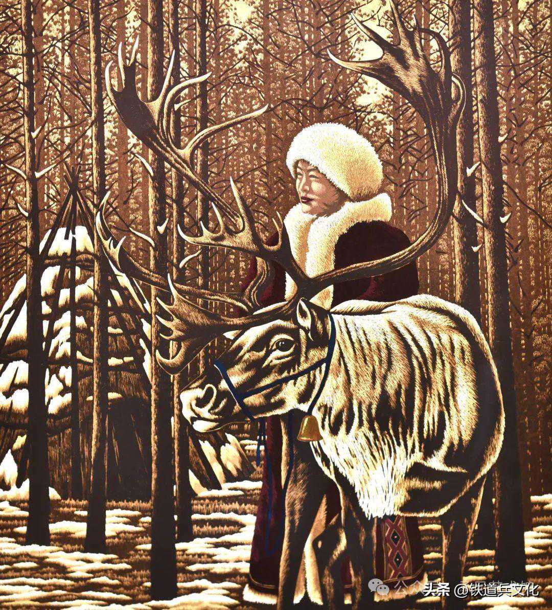 在作品《最后的女酋长--玛丽亚索》中柔和而坚实的轮廓准确生动的表情刻画,借助光线抓住人物最具表现力的瞬间,以人物和背景明暗光线的关系加以生动准确形象的刻画,使作品中的老人具有古铜质地般的脸庞自然贴切又如雕塑一般浑厚具有永恒之美。这些作品都是以其独特的艺术魅力,民俗情感,彰显了中华民族独特和厚重的历史文化自信在其中,深深地为民族文化自信的弘扬和传播奠定了基础。作品中融合了区域民众生活,狩猎,游牧,服饰等等综合艺术形式。是扎根兴安岭大地上在民族互溶的非物质文化遗产,是沉淀和丰富民族文化资源,增加民族文化知识。让更多的人对原生态环境下生活栖息的人们,背后所丰厚的文化底蕴,在保留民族特点的基础上,真正实现现代性,也由此可见木刻版画它的发展创新继承也是与时俱进的。
