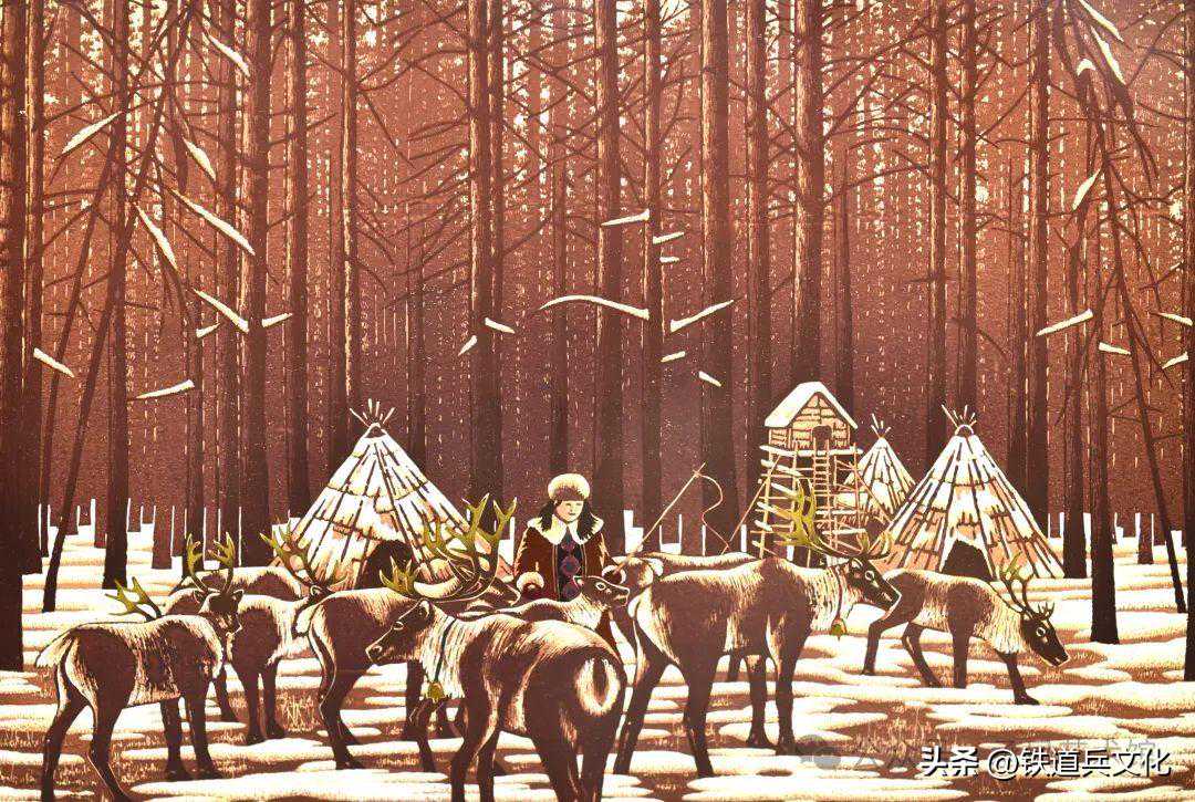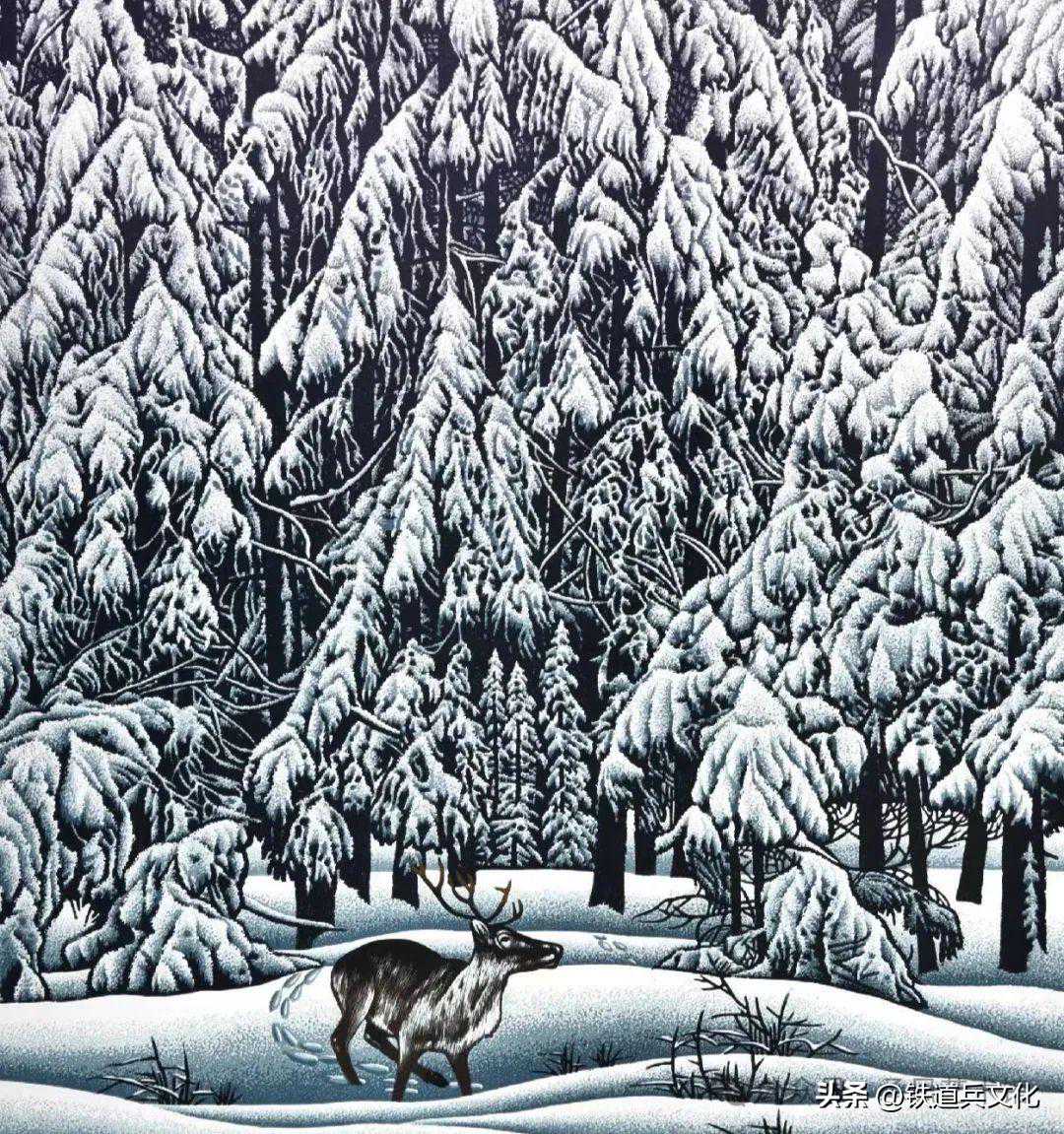 长松傲雪不知年,寒鹿依依别有天,这是著名版画家张士勤先生作品所描绘的冬日里大兴安岭独特的自然风光。大兴安岭是地处我国最北,因独特的纬度和气候环境造就了那里雪域长天一色遥的壮丽景象。中国画历来追捧的是空山鸟无人高山流水的隐世境界,然而在张先生的版画艺术里我们看到的是一个没有花开、没有流水的一个近乎不动的寂寥世界,那里几乎没有色彩没有喧嚣,甚至没有一片绿叶,然而艺术家就是通过这样一个近乎没有生息的素材,寄寓了他独特的天地恒寥,万物自生听的艺术氛围。试想一下,一个淡去了色相,空灵悠远,静穆幽深的世界是多么的静绝尘氛。我们都知道版画是视觉艺术,木刻版画又以独特的刀味与木味使得它在文化艺术史上具有独立的艺术价值与地位。木刻版画不同于其他艺术的突出表现就在于他是以木代纸以刀代笔,再加灵活多变的拓印过程,使得刀、木、印完美的结合从而形成版画独特的趣味语汇和艺术形式。在国画创作中可以大胆落笔肆意用色,而版画能改动的余地是有限的,刻刀入木的刀痕只能扩大,不能缩小。因此,每一刀都要考虑周全,但又不能把自己局限在刀型和刀法上,而是把个人的情感灌注到作品中,融汇在可视的艺术形象上创作性的发挥刀法的特点。这就要求创作者只有刀法的熟练程度是远远不够的,更多的是木刻版画和其他绘画作品一样,应该是思想性和艺术性的高度统一才可以。