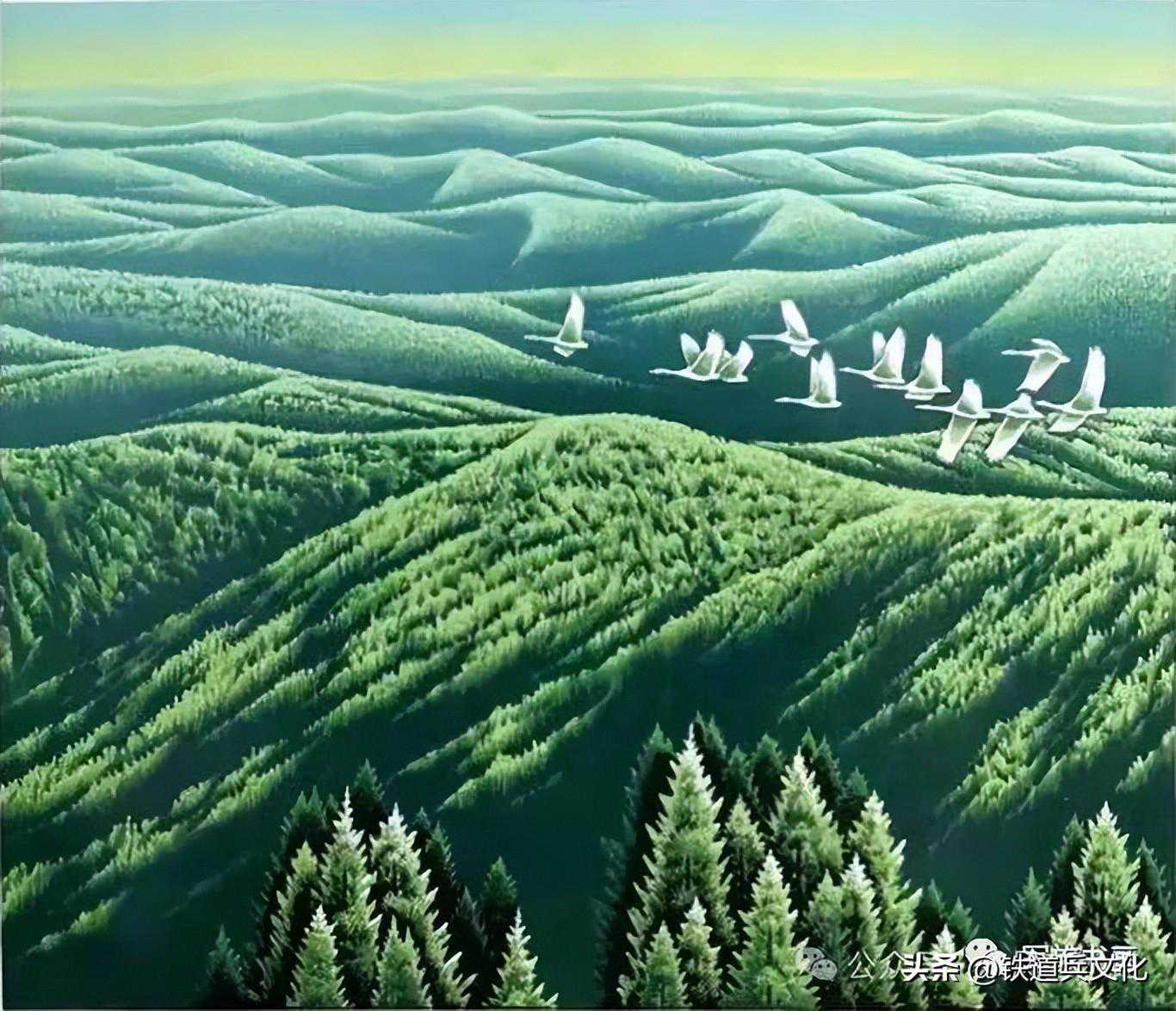 艺术创作让素材活和活素材,是反映了两种生命的态度,前者是实实在在的,强调这个活跃的氛围是在我的观照中的,是有我的生命观。后者则是无我,是在看的过程中建立我和世界的关系是我让世界活。例如在《铁道兵丰碑》《铁道兵-永远的丰碑》作品中有兴安岭极具代表意义的历史丰碑等建筑,可以看出画家艺术底蕴的资深,他善于运用几何形状的构图方式,选择某一物体贯穿整个画面主结构线,对画面进行几何分割。使单一的空间产生大的节奏变化,通过遮挡将视线延伸,特别是背景的处理上,又为生硬的建筑带来鲜活的况味。在这系列作品中我们可以看到点、线、面、体、光、色、质等造型艺术元素的存在,而这些,就是他从生活到艺术的重要表现。