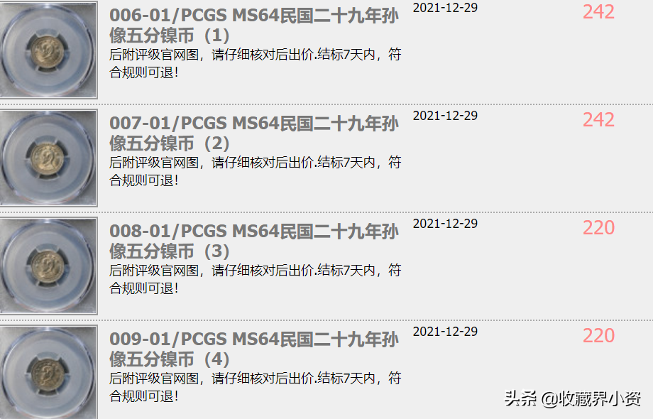 孙像镍币从民国二十五年(1936年)开铸,至民国三十二年(1943年)停铸,国内外众造币厂共铸造了21种版式用于流通行用。其面值有伍分、拾分、廿分和半圆四种,下面我们看一下各面值都有哪些纪年: