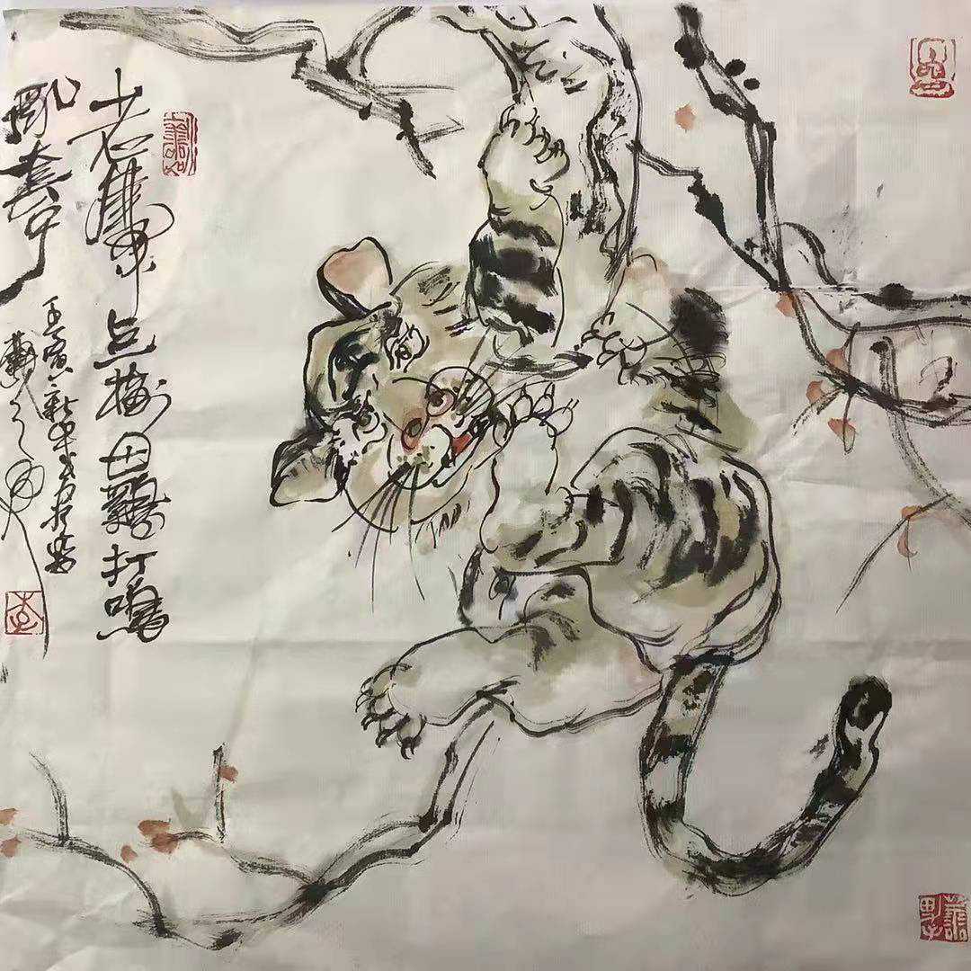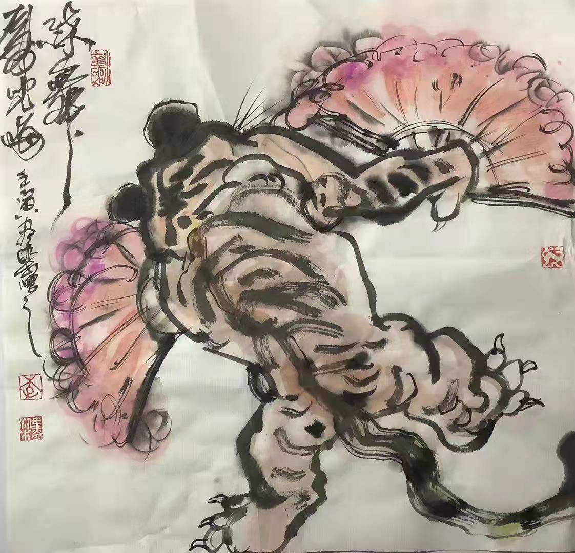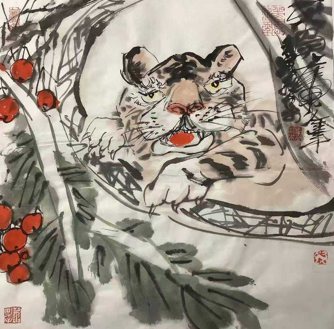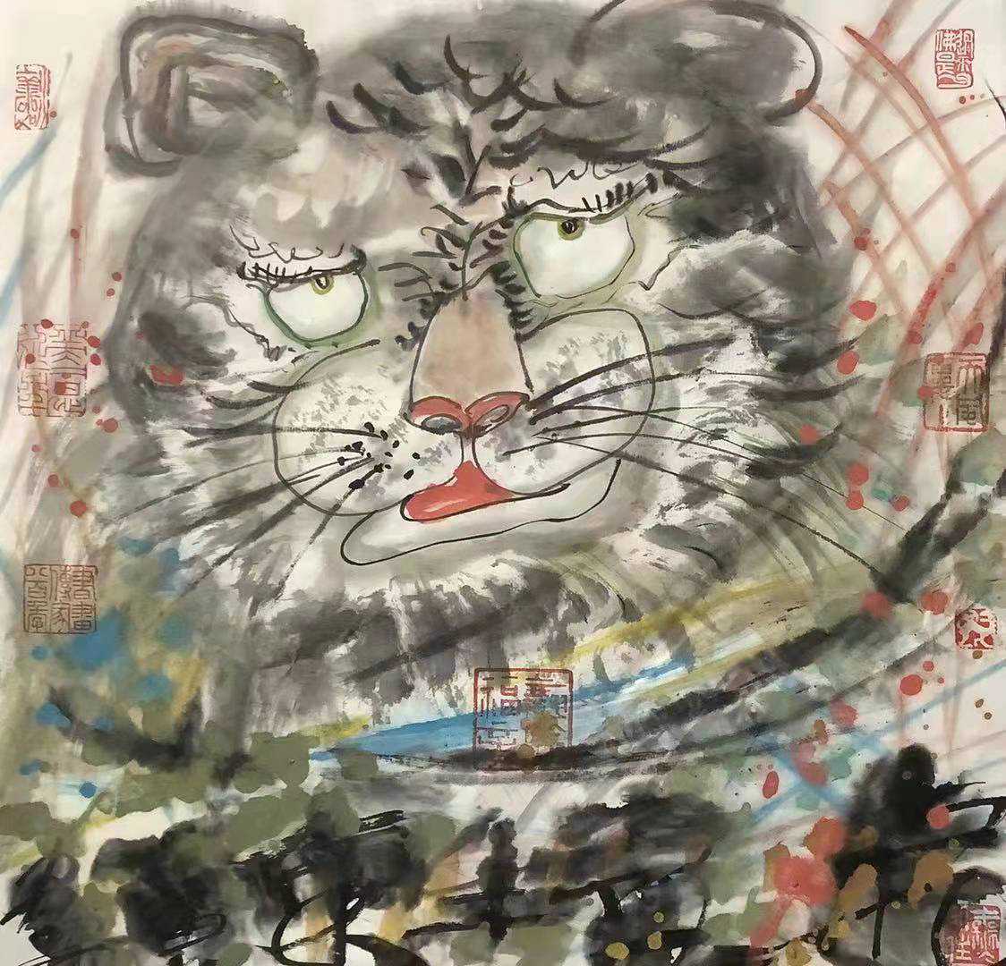 尽染笔下的虎,是一个鬼使神差气象万千的世界。长啸一声山月小,云飞剑舞雄千里。目电声雷震万方,虎胆雄风、虎虎生威……林林总总,人们对虎的敬畏,虎的赞美,虎的歌颂千古不断……尽染笔下的老虎更多的是以哲学、人文、趣味好玩,来表达。将张牙舞爪的老虎,幻化出变化万千童心万丈的赤子般的老虎。他的虎挥笔的,跳舞的,钓鱼的,舞扇的,醉酒的全部都拟人化,好玩有趣,味道隽永,可读可想趣味无穷……陈先生诗赞:曾闻笠翁钓江雪,亦有鹭鸶追汛渔,欣见北冥虎甩钩,原是尽染随手趣……去岁曾赶牛上树,今朝更逼虎捉鱼。各位方家的夸赞,如过江之鲫一起涌来……