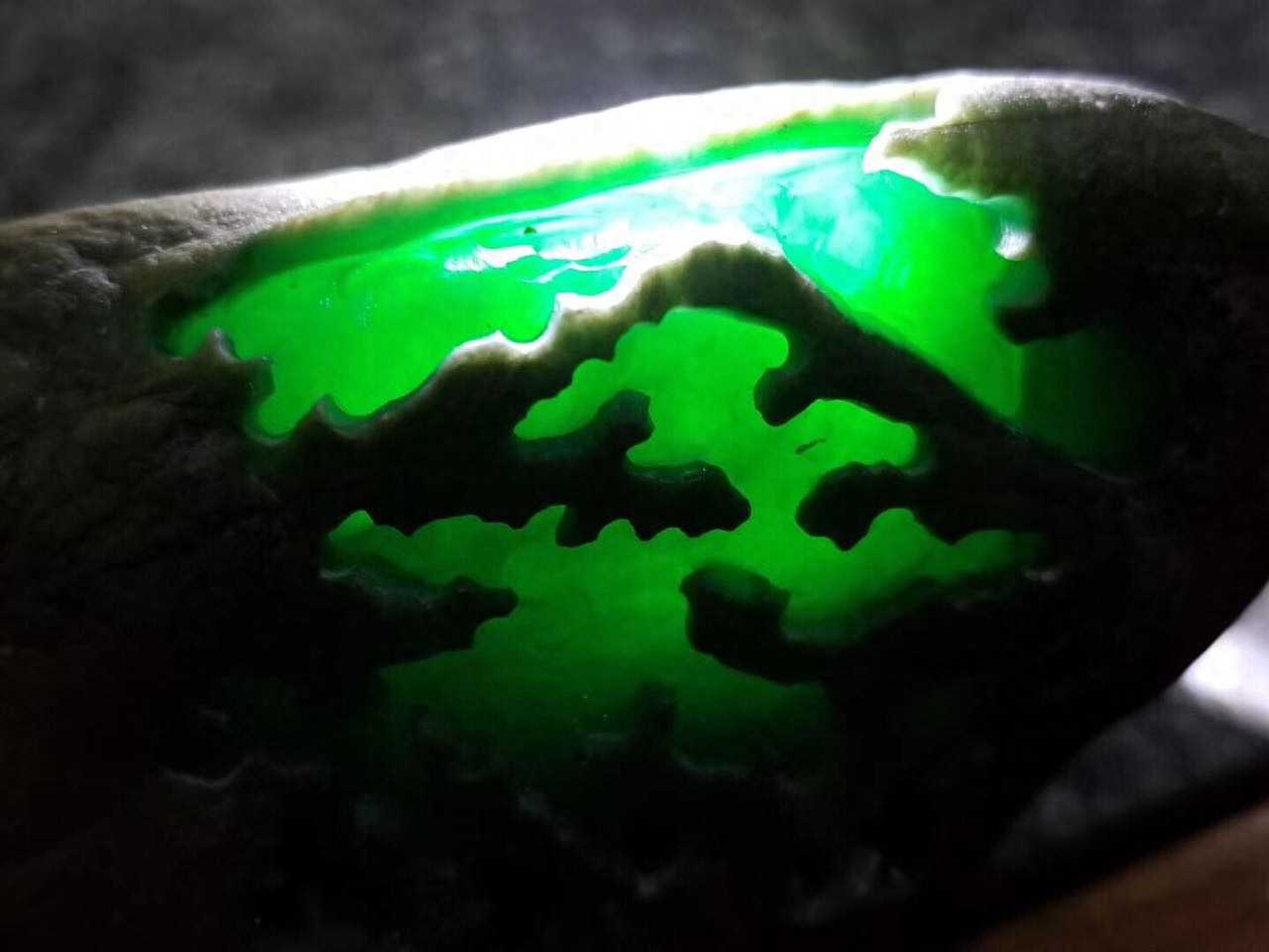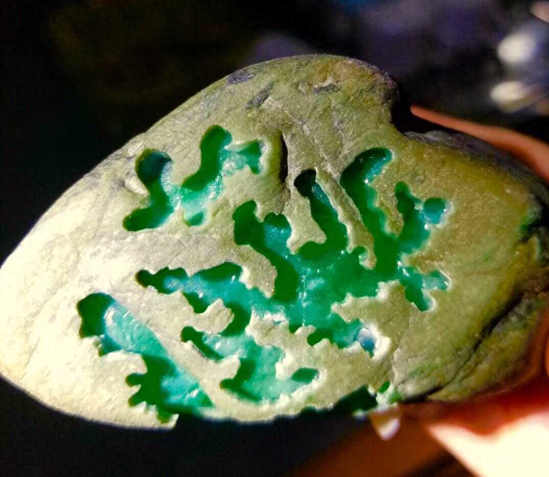 这是一块后江满色的料在,没有开窗之前,只是打灯有色的表现,其实,凭我的经验我就知道色肯定会进去,而且种不会差