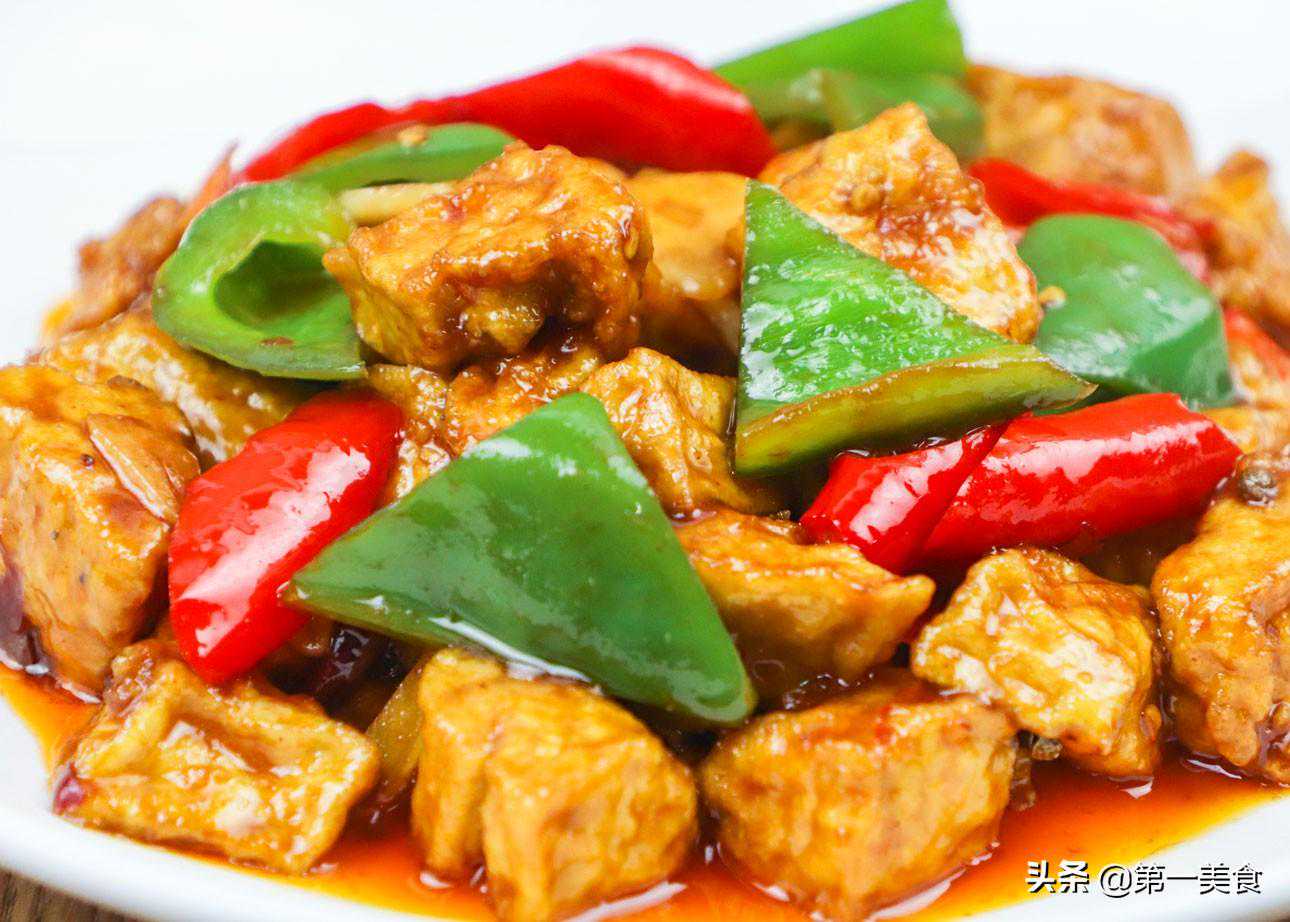 倒入青红椒,从锅边淋入适量的清水,开始调味:加入食盐,鸡粉,胡椒粉,生抽翻炒化开调料,把炸好的豆腐倒入锅中,淋点老抽让汤汁更加红润。