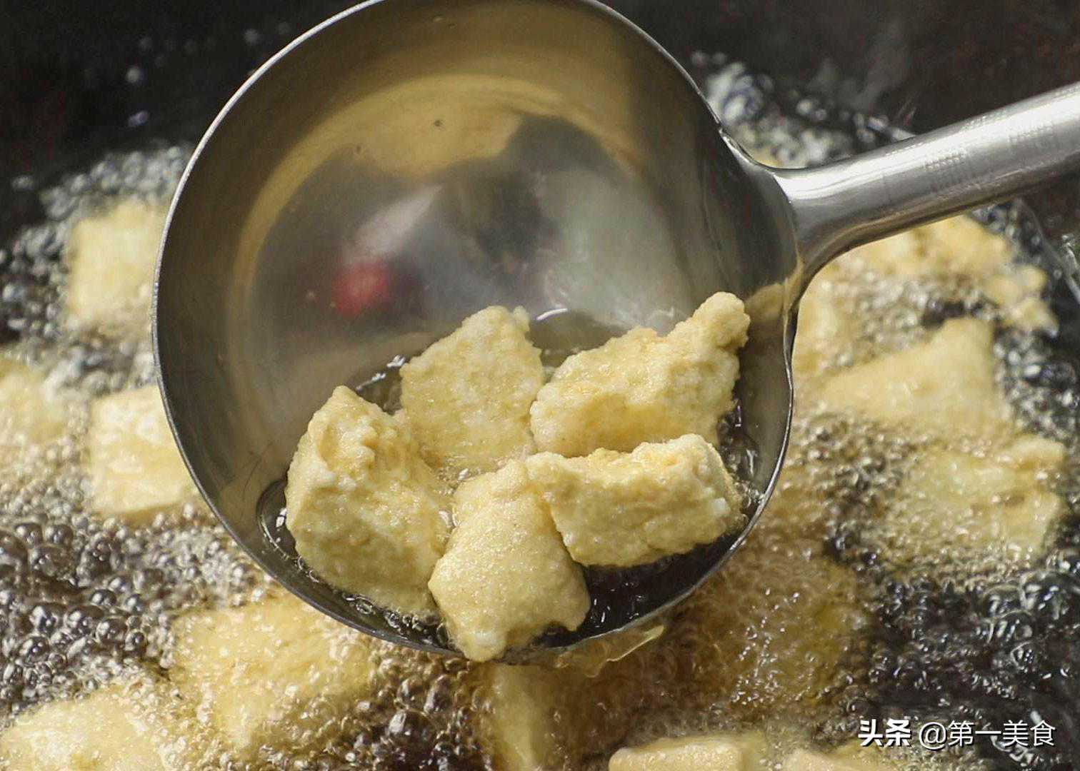2.把老豆腐过油炸一下,油温5成热时,保持小火炸3分钟左右把豆腐表面炸微黄捞出来控油。