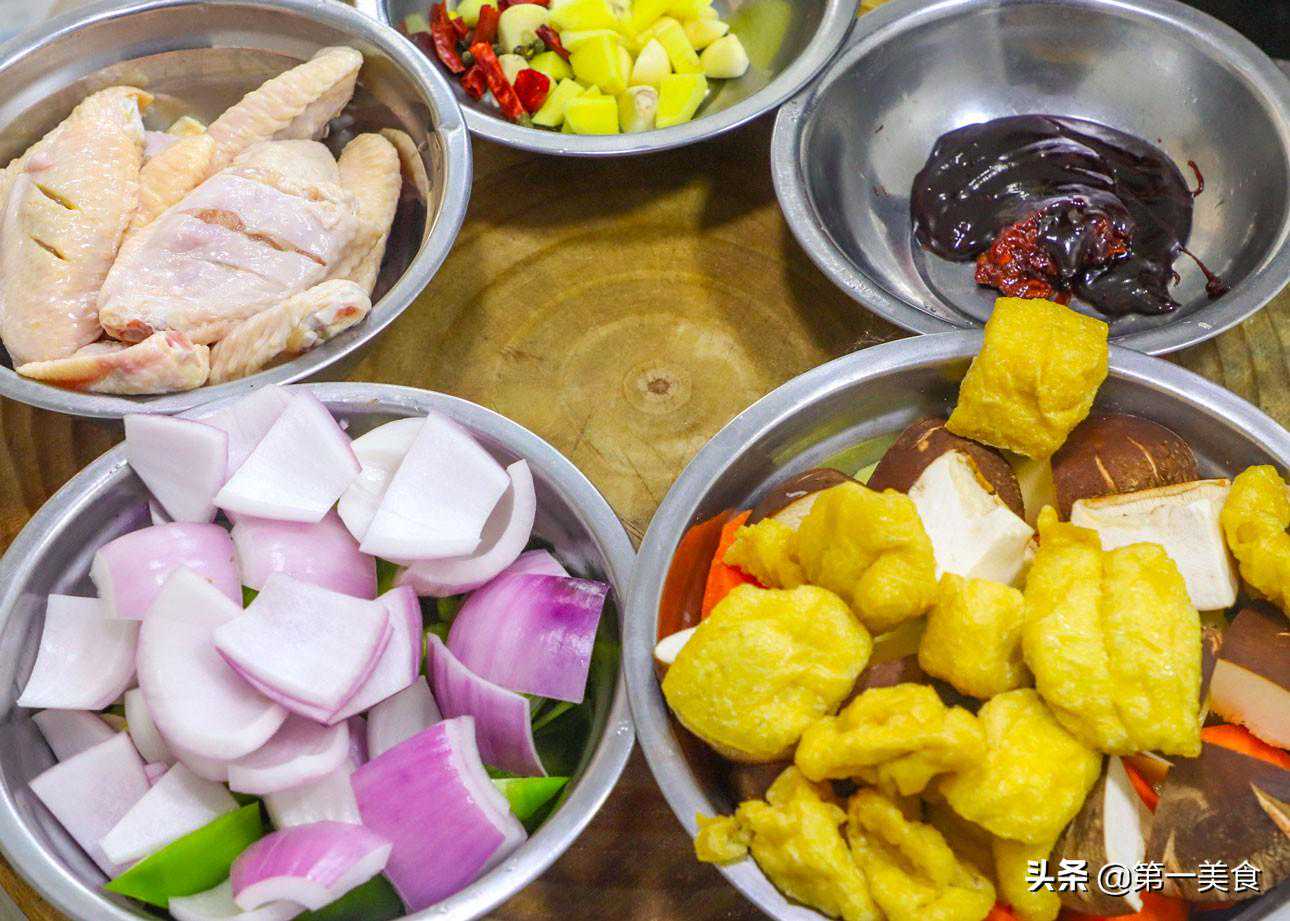 切点土豆块、胡萝卜块、再切点香菇放在一个盆中,再放点豆泡。切点青椒块、洋葱块、大蒜粒、生姜粒抓入一小把干辣椒,几粒青花椒。