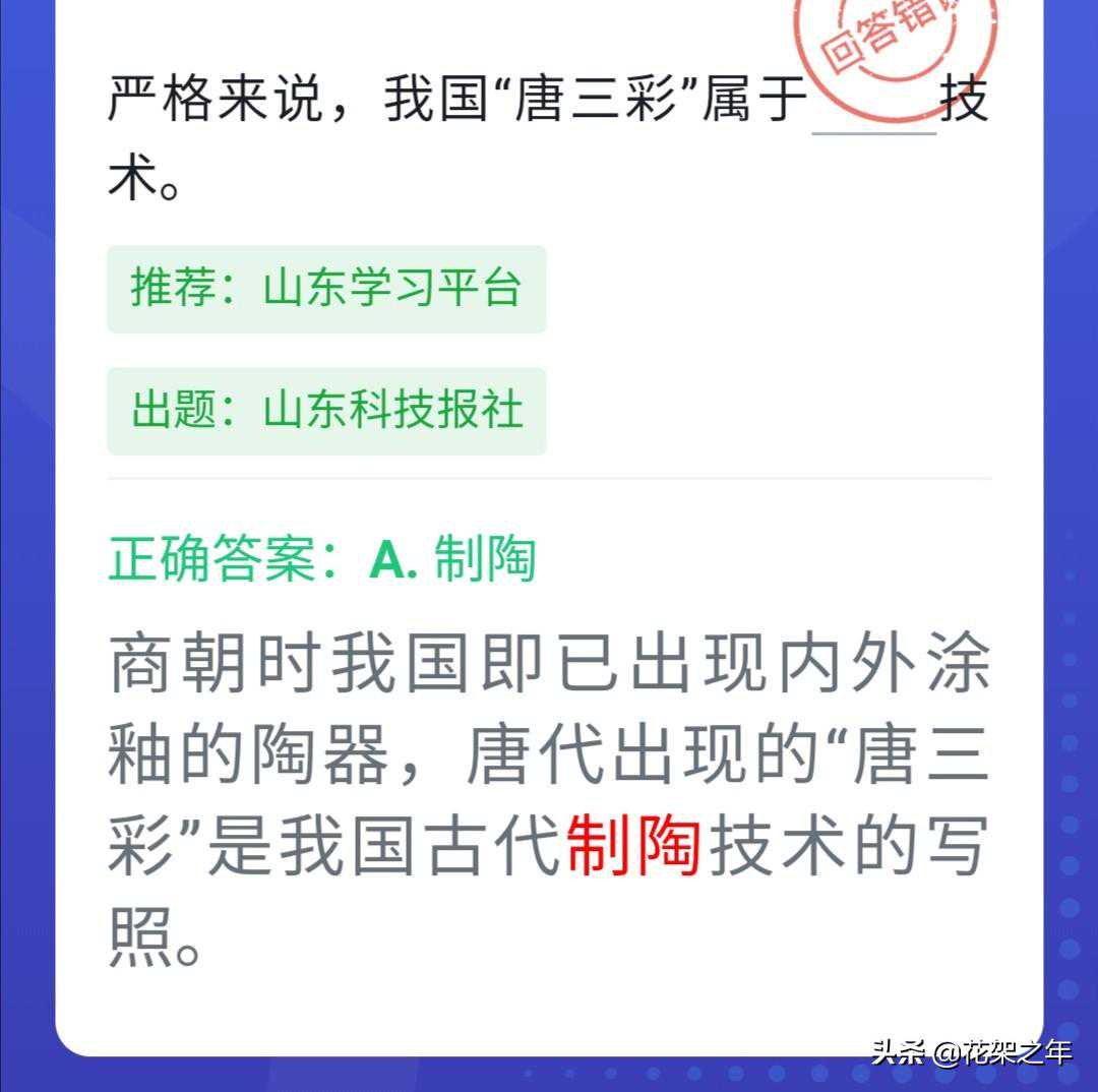 再看第二题,在商朝时期,我国即已出现内外涂釉的陶器,在唐代出现的唐三彩,是我国古代(制陶)技术的写照。