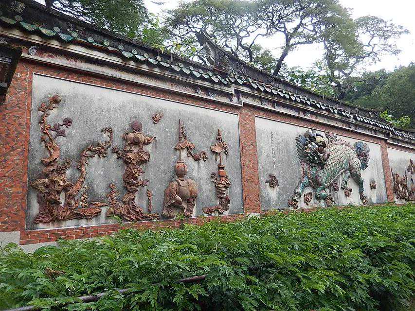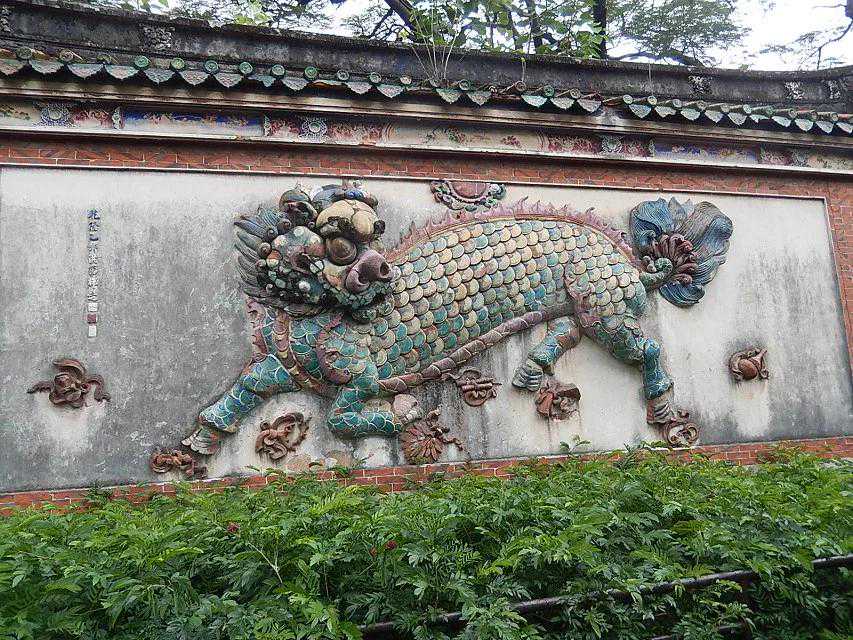 去东塔的路上,经过一照壁墙,墙上有精美的浮雕,分为三部分:中间是清乾隆年间用彩色陶瓷构成的麒麟踏花图,麒麟神态逼真,蹄下落英缤纷。左右两边是梅花、仙鹤、鹿、大象、兰草等吉祥物构成的图案。