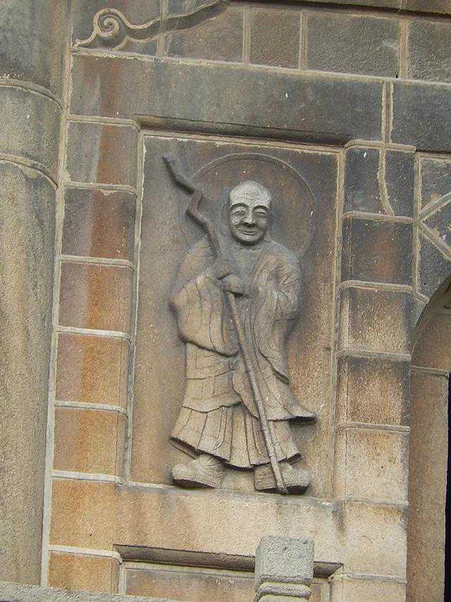 眼前这座别致的建筑就是开元寺的山门,也叫天王殿。它建于唐武则天垂拱三年(公元687年),前后已经过几次火灾烧毁与重建,现存建筑是民国十四年(公元1925年)修建的。大家先请看这石柱:上下端略细,中部较粗,呈梭子状,学名梭柱,据考证为唐朝的石柱风格,年代已十分久远了。石柱上还悬挂有一木制对联“此地古称佛国,满街都是圣人”。这是南宋大理学家朱熹所撰,近代高僧弘一法师所写的。它是泉州这个具有浓厚宗教文化色彩的古城风貌的真实写照。分坐在天王殿两旁的是按佛教密宗规制所配置的密迹金刚与梵王。它们怒目挺胸,状极威严,与一般寺庙所雕塑的四大金刚有较大差别,有人谑称它们为“哼哈二将”。