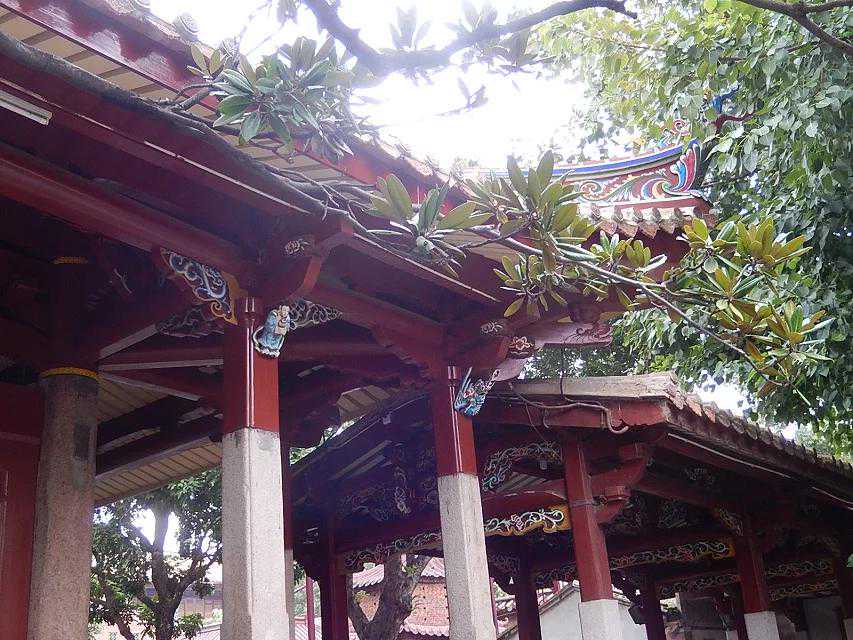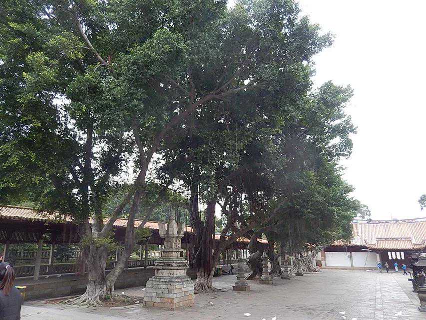 跨过山门就到了拜亭,然后进入拜庭院中。拜庭两边分列着八棵大榕树,树龄在200至800岁,两旁古榕参天。站在这里,我们可以看到拔地而起的东西塔和宽敞明亮的东西两廊对称地排列在两旁,而我们所在的位置就在开元寺的中轴线上。佛教传入我国巳有一千多年历史,并在中国落地开花,与中国文化融为一体。开元寺的布局就突出了我国古建筑的南面为尊和中轴线为主的特点。中轴线自南而北依次有:紫云屏、山门(天王殿)、拜亭、大雄宝殿、甘露戒坛、藏经阁。东翼有檀越祠、泉州佛教博物馆(弘一法师纪念馆)、准提禅院、东壁寺(古船馆);西翼有尊圣院、功德堂、水陆禅寺等。