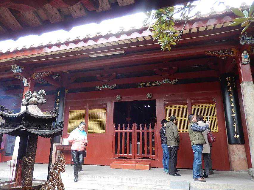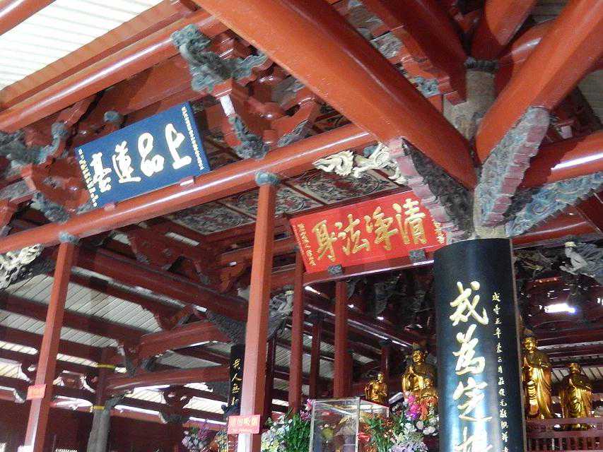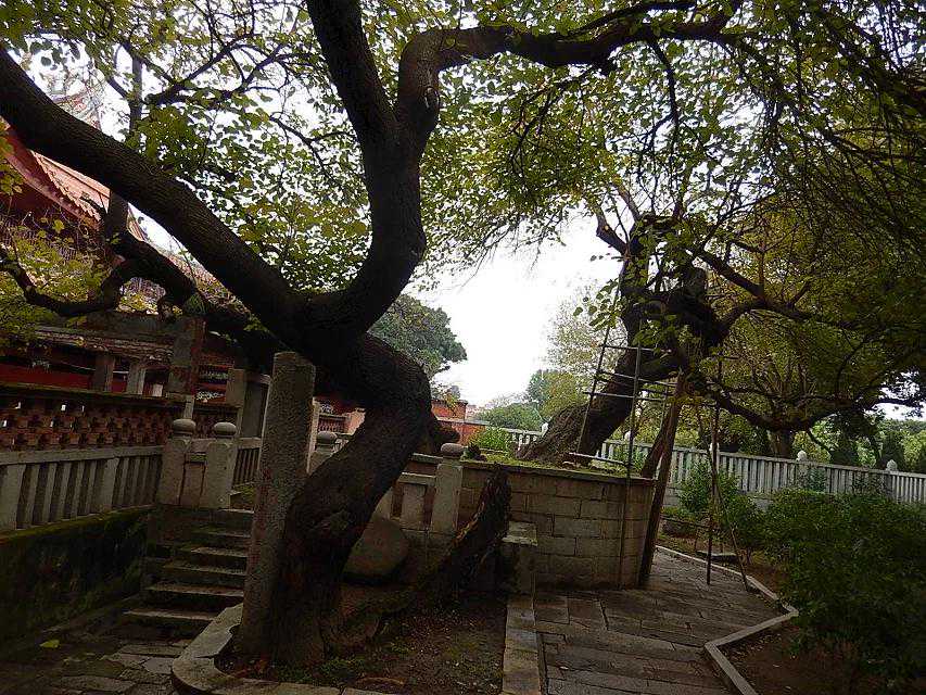 接着,我们一起来到位于中轴线大雄宝殿后面的甘露戒坛参观。甘露戒坛,建在中轴线的第二台阶上。据说唐朝时候,此地常降甘露,一个叫行昭的和尚于是在这里挖了一口甘露井。北宋天禧三年(公元1019年)在井上建坛,遂称甘露戒坛。南宋建炎二年(公元1128年)敦炤和尚认为戒坛不符合规范,又按《南山图经》改建为五级,其间高低宽窄都有严格的限制。后经元、明多次重修,现存建筑是清康熙五年(公元1666年)重建的四重檐八角攒尖式结构。坛顶正中藻井采用如意斗拱,交叠上收,如蜘蛛结网,似回纹织锦,结构复杂而精巧。坛之四周立柱斗拱和铺作间24尊“飞天乐伎”,身系五彩飘带,手持琵琶、二弦、洞萧、响板,轻歌曼舞,翩翩若飞,使人马上想起敦煌的飞天艺术。它们与百柱殿的频伽一样,既是建筑艺术的瑰宝,又是研究南音与南戏十分宝贵的形象资料。戒坛门前廊柱上有副对联,有点意思,抄录如下:冷暖自知不必别求甘露;我人无相都来随喜戒坛。门廊前的巨大菩提树长得郁郁葱葱,似乎早已领略甘露的恩惠,悟到了真谛。