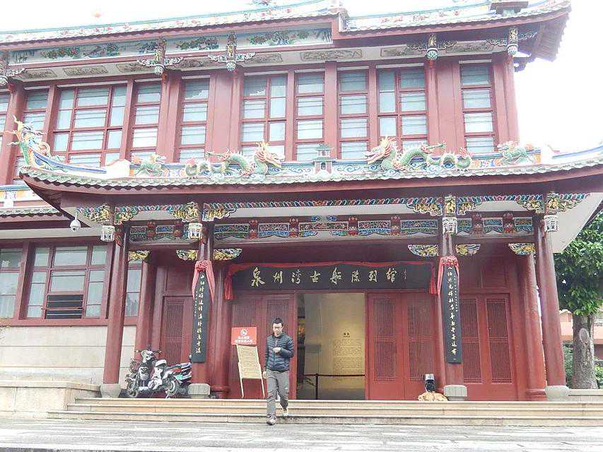 我和师兄黄大明一起还参观了开元寺东侧的泉州湾古船陈列馆(原为东壁寺)。该馆藏品1万余件,其中一级藏品102件。博物馆中间展出的是镇馆之宝——1974年在泉州后渚港出土的宋代三桅远洋商船,残长24.2米,宽9.15米,分为13个水密隔仓,为中国自然科学史上最重要的发现之一。根据研究,这是一艘13世纪泉州造的中型远洋货轮,长度为34米、宽11米、型深4米,载重量达到200余吨。它是把“海上丝绸之路”从泉州连接近百个国家和地区的重要物证,是古代泉州开放与繁荣的见证。展出的另一件一级文物是毗湿奴石雕像,它是中国仅见的印度教文物,也是14世纪中印文化交流的见证。该馆设有3个专题陈列馆。泉州湾古船陈列馆,展出两艘宋代海船的部分实物和宋元明清石、木、铁三种材质的锚具以及各时代的海船模型等文物;泉州宗教石刻陈列馆,展出宋元时期外来宗教中的伊斯兰教、印度教、基督教、摩尼教墓碑、墓盖、雕像、寺庙建筑构件等300多件;泉州外销瓷陈列馆,展出历代从泉州港输入国际市场的陶瓷器500多件。
