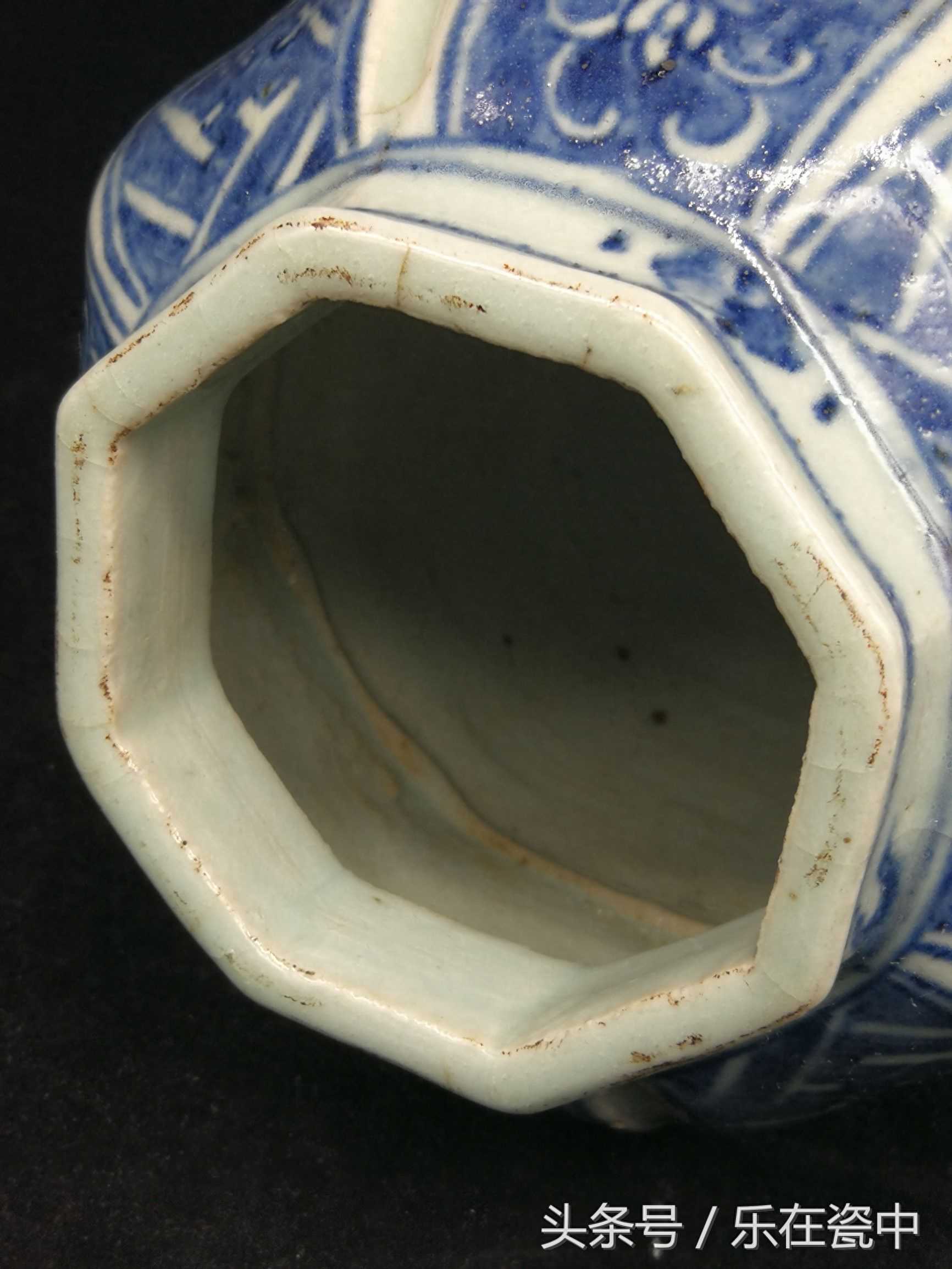 明万历永保长春款缠枝莲青花纹八棱罐。根据笔者对万历民窑瓷器的认识,万历的釉色是乳白色微微闪青。万历早期青花发紫,晚期青花发黑发晕散。