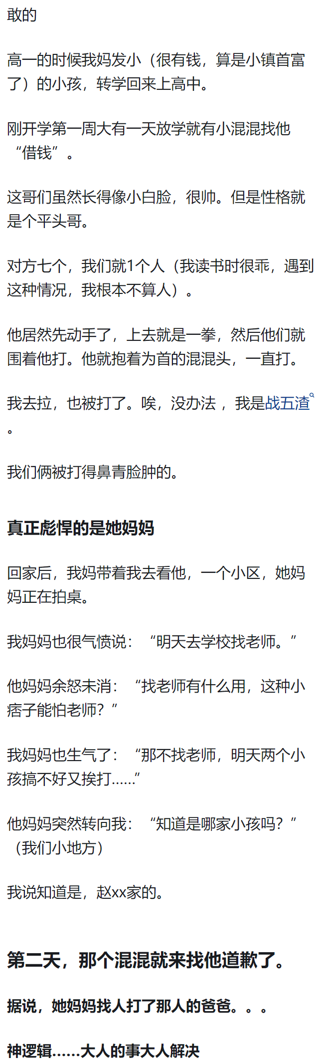 每次看到这些真的不敢生孩子,因为我知道我这辈子就是个基层普通人,如果孩子被欺负了,我很大可能也只是像你爸那样。太痛苦了父母之爱子,则为计之深远。我上学的时候也是这样,得罪了有钱人家的大小姐,她心上人跟我表白,我拒绝了,大小姐还是堵着我骂我婊子,我家里穷,但是我也是独生女,也是我爸妈的掌上明珠,我也傲,所以我和她打起来了,打到最后也是这样,她家里有权有势,我爸来学校,她的家长看都没看我们父女一眼,直接走过来就是一脚踹倒我,回到家,我父亲也和你的父亲说了一样的话。这些蠢混混以为有钱人只是有钱。其实人家有钱是因为有能量--人脉。祝看到这里的你天天开心,顺风顺水,