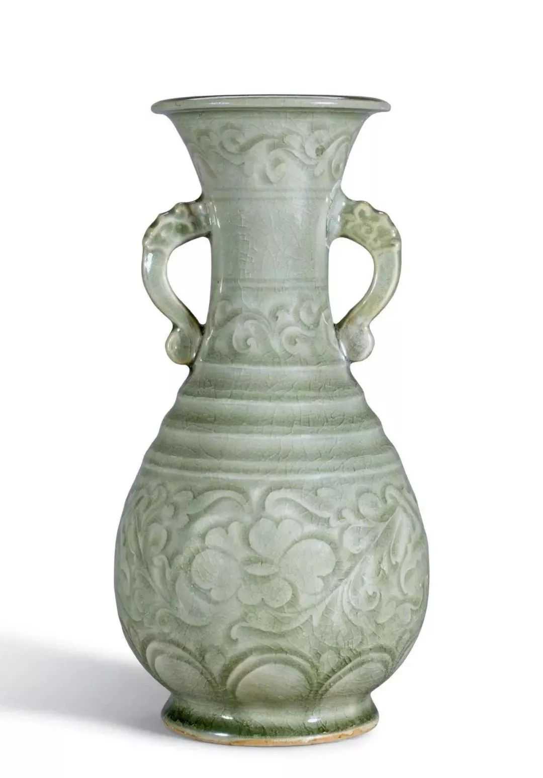 宋耀州窑青釉刻花卉纹双耳瓶(4-6万)