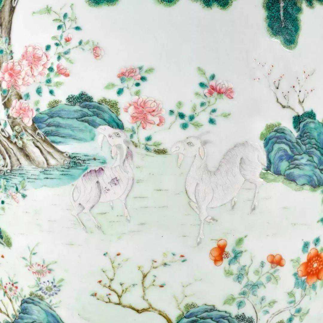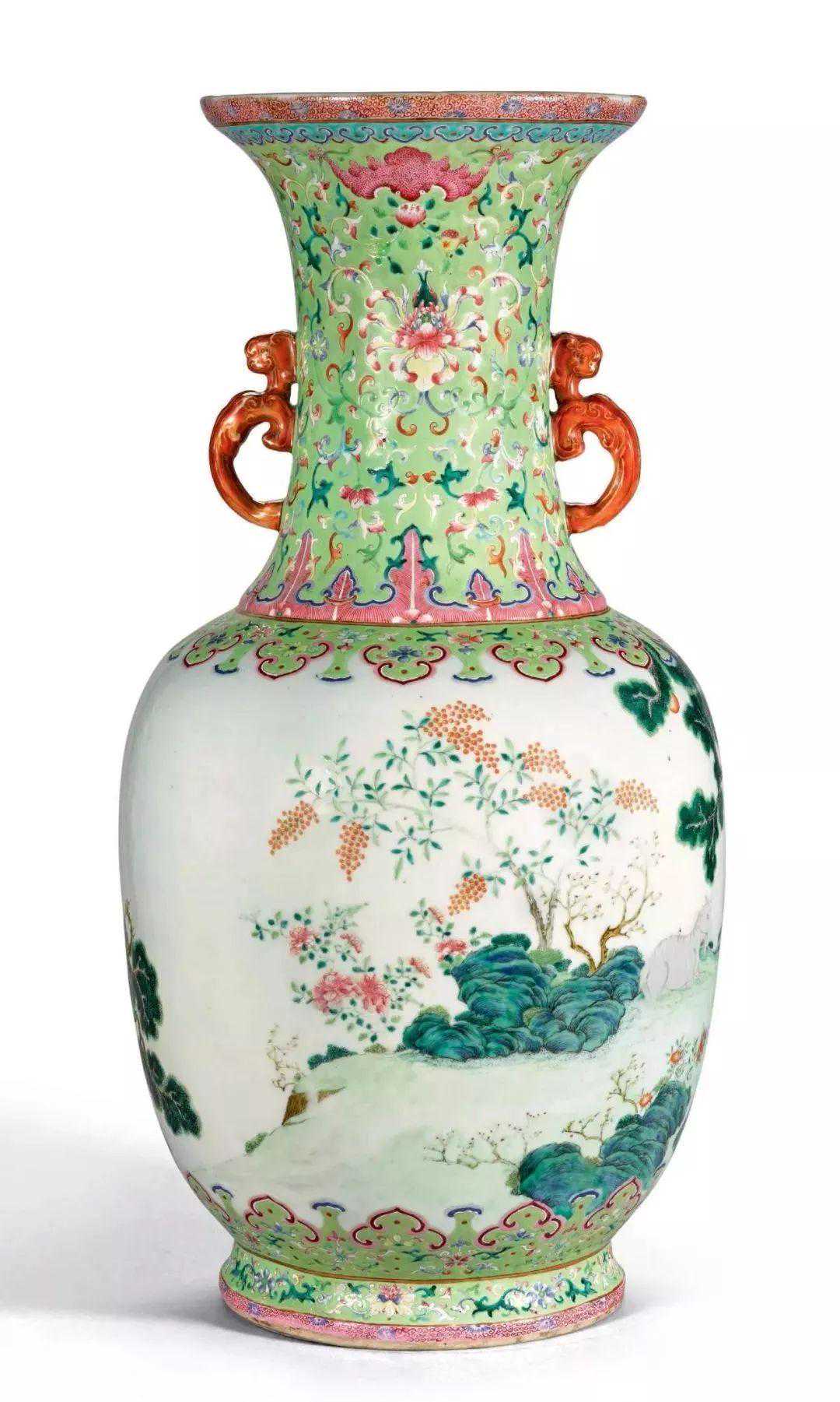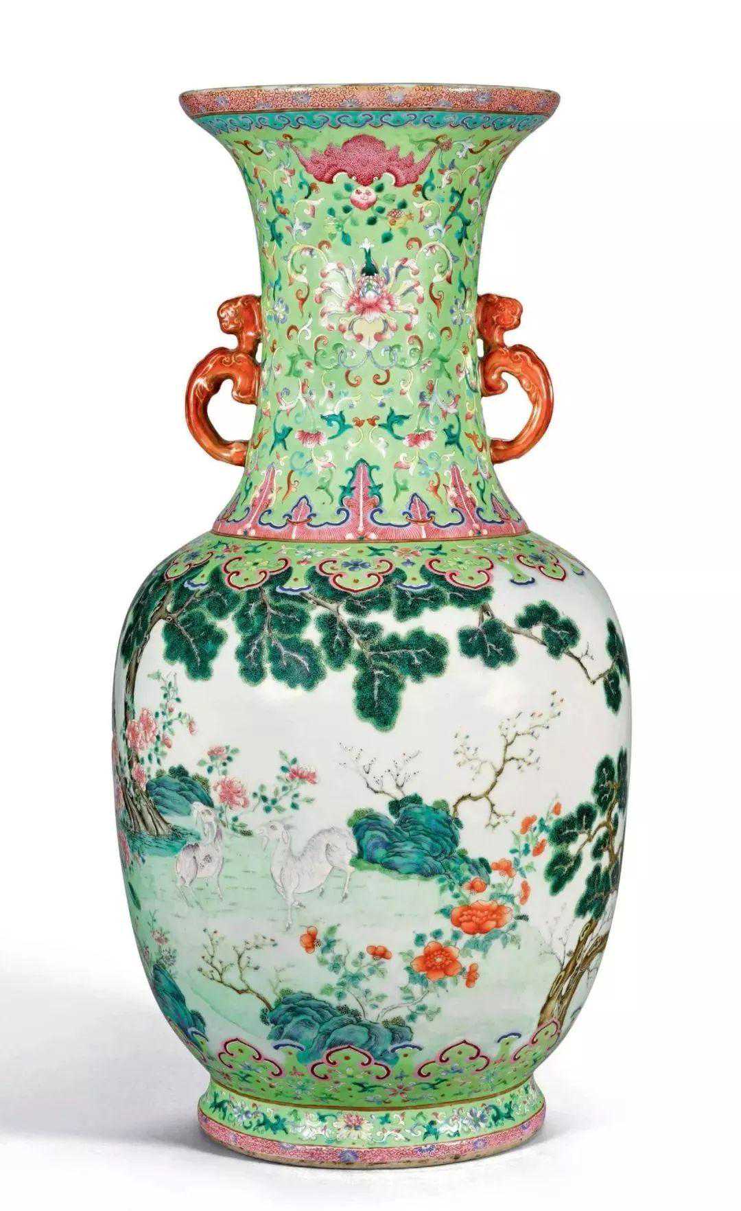 清道光绿地粉彩通景三羊开泰双螭耳大瓶(30-50万)