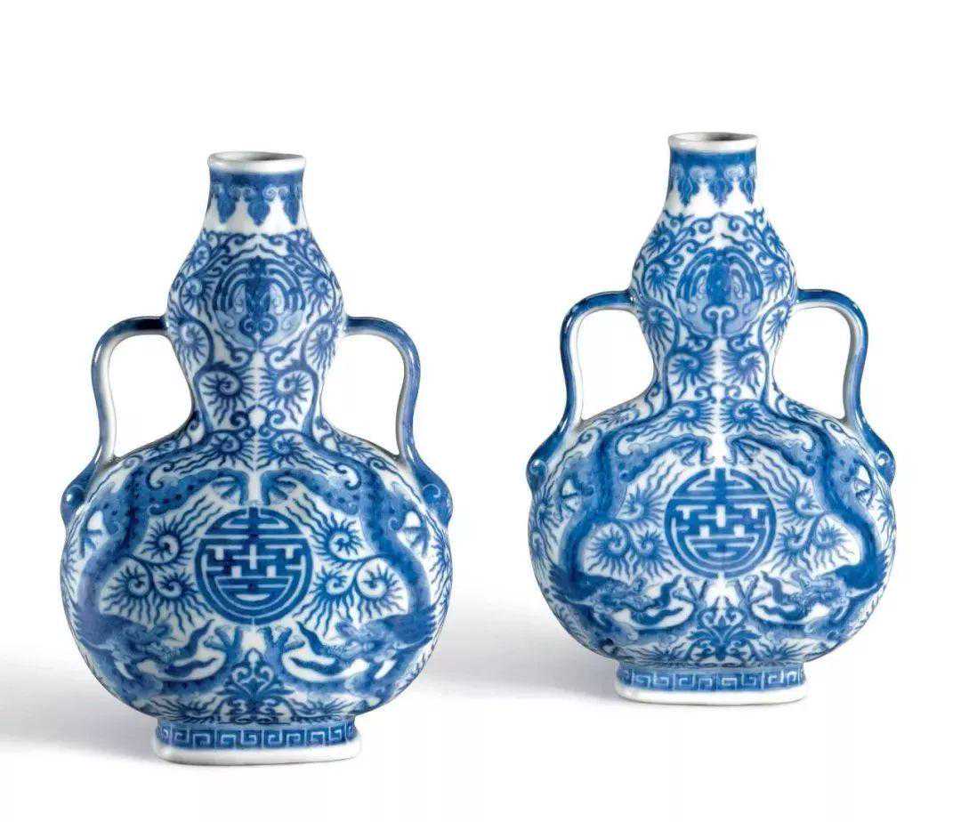 清乾隆青花游龙献寿纹如意耳葫芦瓶一对(6-8万)