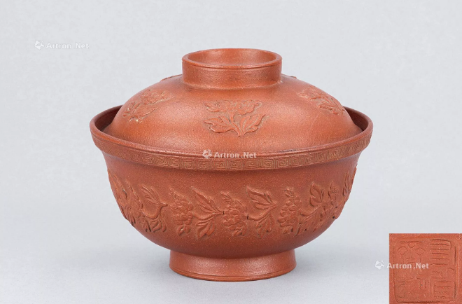 清乾隆(1736-1795)紫砂花卉纹回纹盖碗