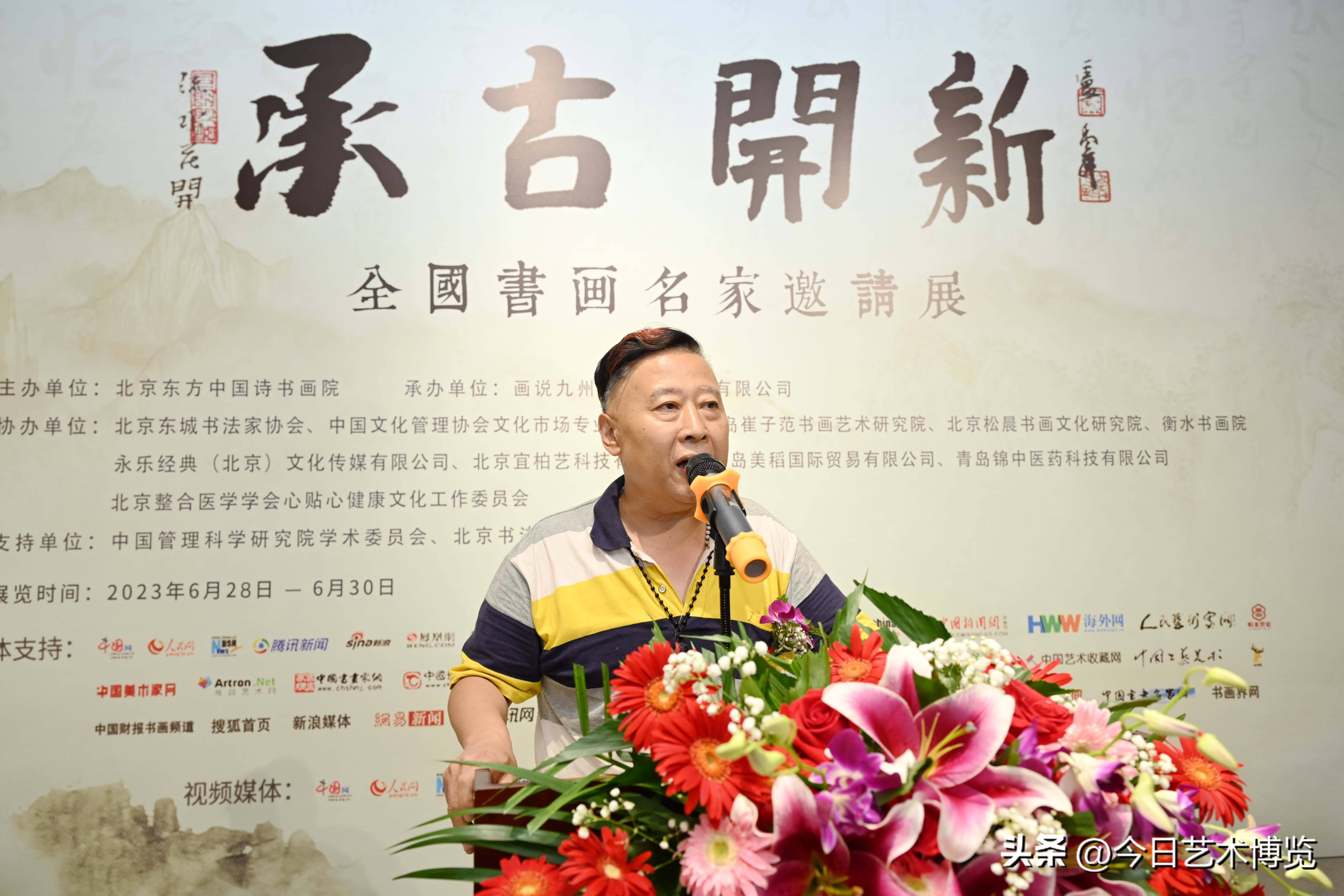 6月28日下午3时,由北京东方中国诗书画院主办;画说九州(北京)文化有限公司承办;北京松晨书画文化研究院、崔子范书画艺术研究院、北京宜柏艺科技有限公司、永乐经典(北京)文化传媒有限公司、青岛美稻国际贸易有限公司、青岛锦中医药科技有限公司协办的“承古开新·全国书画名家邀请展”在北京炎黄艺术馆盛大开幕。开幕式由中国书法家协会理事、北京书法家协会副主席田伯平主持。