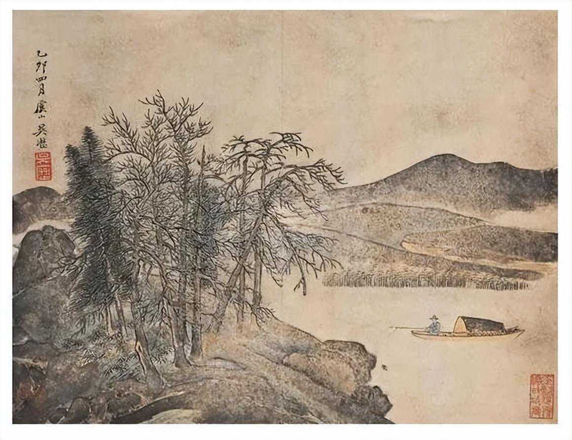 吴历的绘画就是在这样的历史背景下演进的。加入天主教耶稣会后,吴历全身心投入了教会的工作,大约有近20年的时间他很少绘画创作。所以,美术史上普遍认为吴历一生创作的高峰是在40~50岁这段时间,他的许多代表作就是作于这一时段内,比如上海博物馆收藏的《山中苦雨诗画卷》(1674年作,43岁)、《湖天春色图轴》(1676年作,45岁),北京故宫博物院收藏的《兴福庵感旧图卷》(1674年作,43岁)等等。