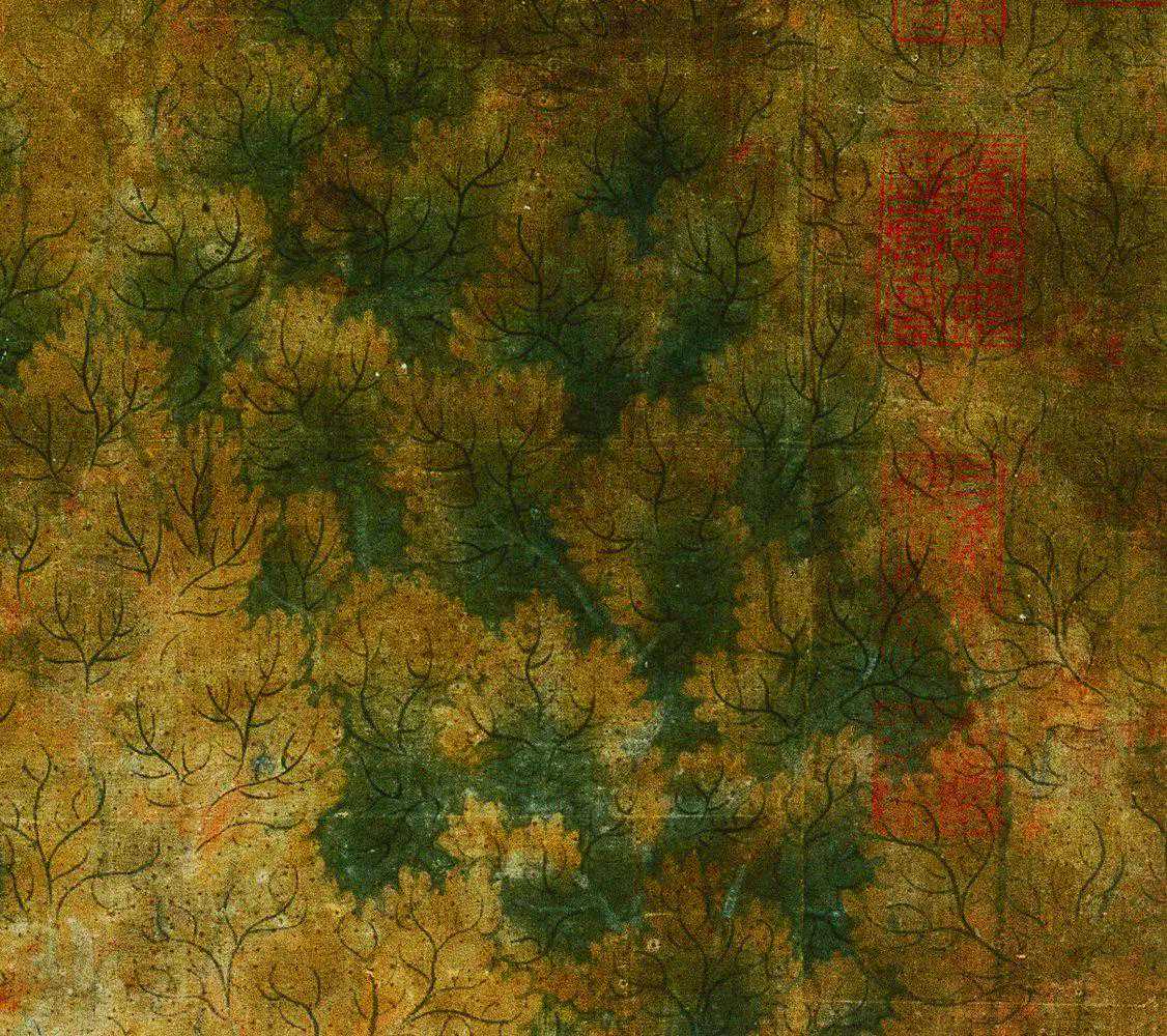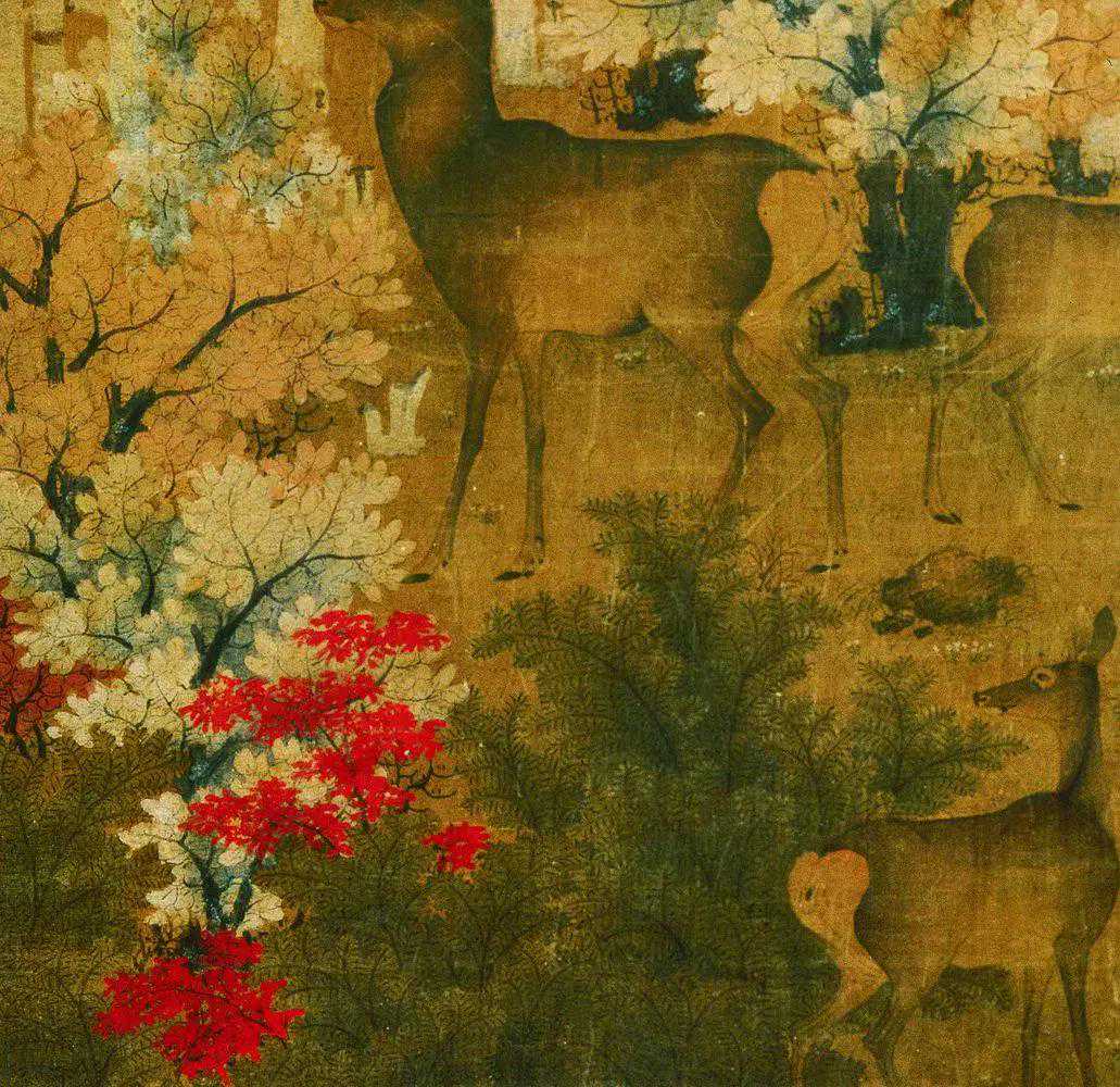 张衍先生也认为丹枫呦鹿和秋林群鹿图是同一屏障中的两幅(《文物参考资料》一九五五年第七期《反对美国侵略集团劫夺我国在台湾文物——记述故宫博物院被劫往台湾的一些名画》张衍)在尽情展露盛夏的绿意之後,秋天这个令人舒爽怡然的季节跟著悄然到来,所有的树叶在此时染上了缤纷的色彩,深红、淡橘、浅黄、碧蓝……似乎要赶在严冬来临之前,释放所有的美丽。鹿群抵不住诱人的秋色,踩著轻快脚步进入这片色彩斑斓的秋林,瞧鹿儿所呈现的各种姿态,彷若与眼前丰美的景色唱和起舞。