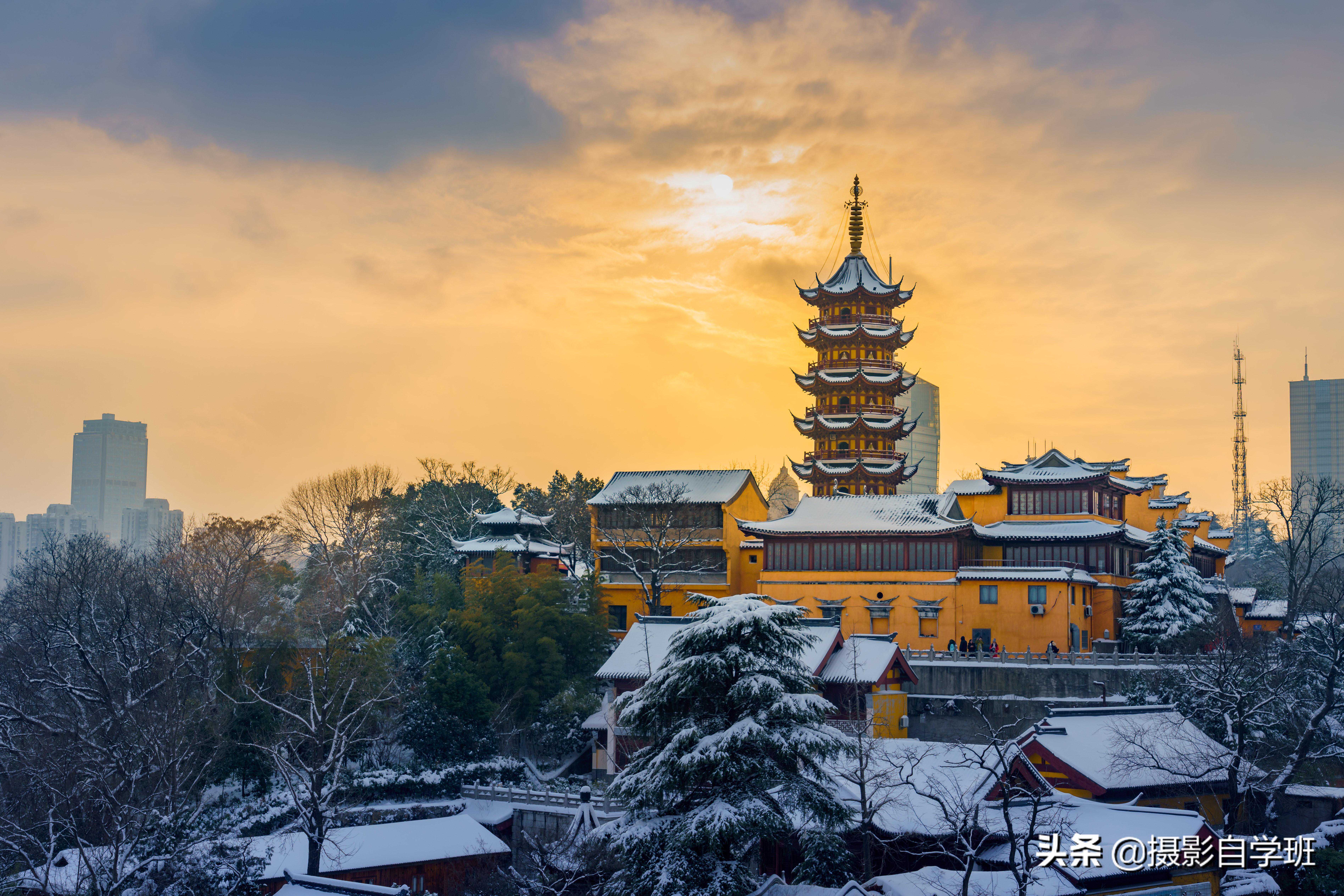 而我们在清晨傍晚,日出日落前后,照片会有漂亮的色彩,渲染出整体的氛围,会更加好看。黄色的建筑,黄色的背景天空与雪景形成很好的冷暖对比,更能带动观者的情绪。让观者有情感上的共鸣,照片会更受好评。