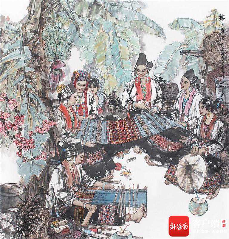 乔德龙的中国画《织锦图》、陈茂叶的版画《幸福山歌》、阮江华的中国画《收获时节》、易至群的中国画《黎乡母与子》、齐英石的中国画《锦上添花》、徐鸿才的版画《欢乐三月三》、林明俊的中国画《烟波声远》、刘小莉的中国画《琼崖尽是春》、王家儒的油画《流金岁月》《南国骄阳》、张继光的油画《寨子来客》等作品,都是从黎族苗族人民的生活中汲取养分,同时也是对黎族苗族人民生活的礼赞。