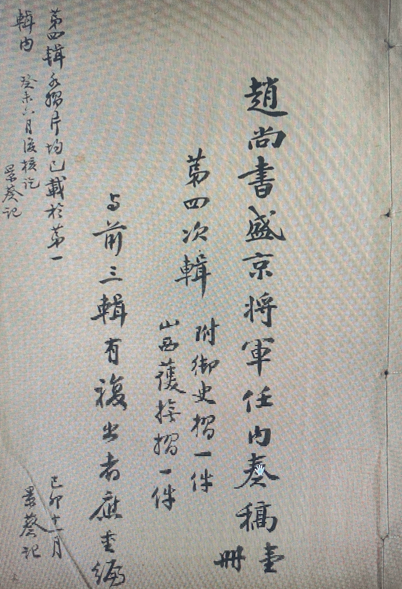 在图书馆同人整理《赵尚书奏议》之初,或许是因为文书体量过于庞大,很快便出现了重复整理、重复收录的差错。1939年12月,叶景葵在《赵尚书奏议》稿本第四辑的封面上批注云:“《赵尚书盛京将军任内奏稿》一册。第四次辑。附御史折一件、山西护抚折一件。与前三辑有重出者,应重编”(柳和城编著:《叶景葵年谱长编》,上海:上海交通大学出版社,2017年,第960页)。关于第四辑所收文献,叶景葵复于1944年再次批注云:“第四辑各折片均已载于第一辑内”(叶景葵:《赵尚书奏议第四次辑录题识》,叶景葵撰、柳和城编:《叶景葵文集》中册,第944页)。上述批注应当是叶景葵在整理赵遗稿时的备忘,提示第四辑主要为“赵尚书盛京将军任内奏稿”,与第三辑存在内容重复的情况,且第四辑所收折片与第一辑近乎相同。由此一例可以想见,在合众图书馆同人分批整理《赵尚书奏议》时,各辑所收文献存在重复的情况,叶景葵在1940年代初即意识到该问题。