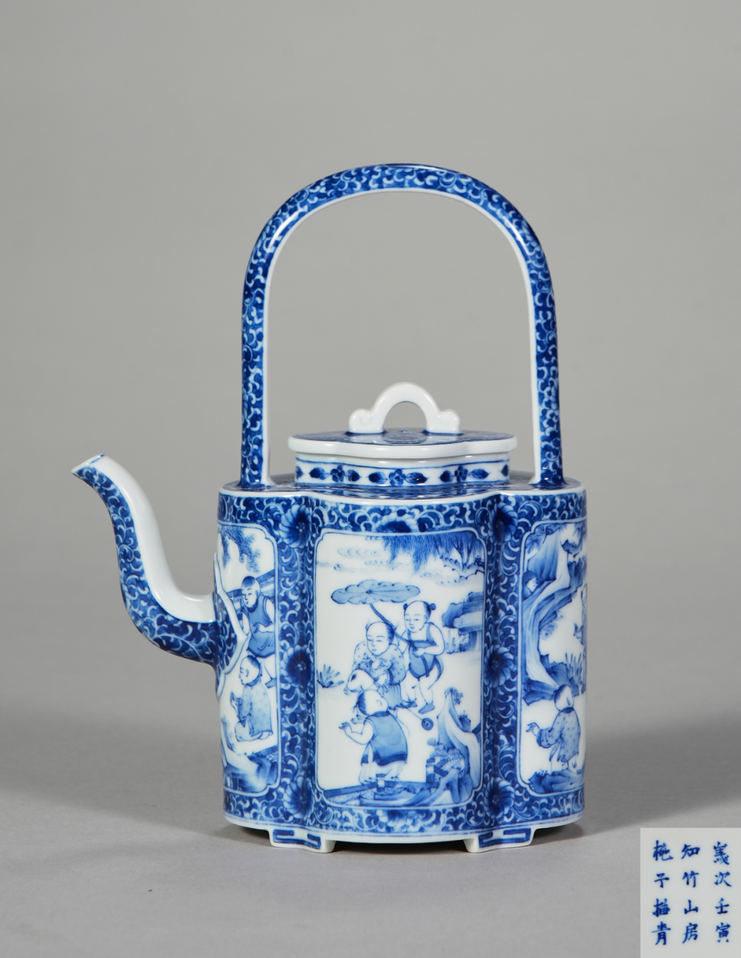 知竹山房青花璎珞开窗婴戏提梁壶