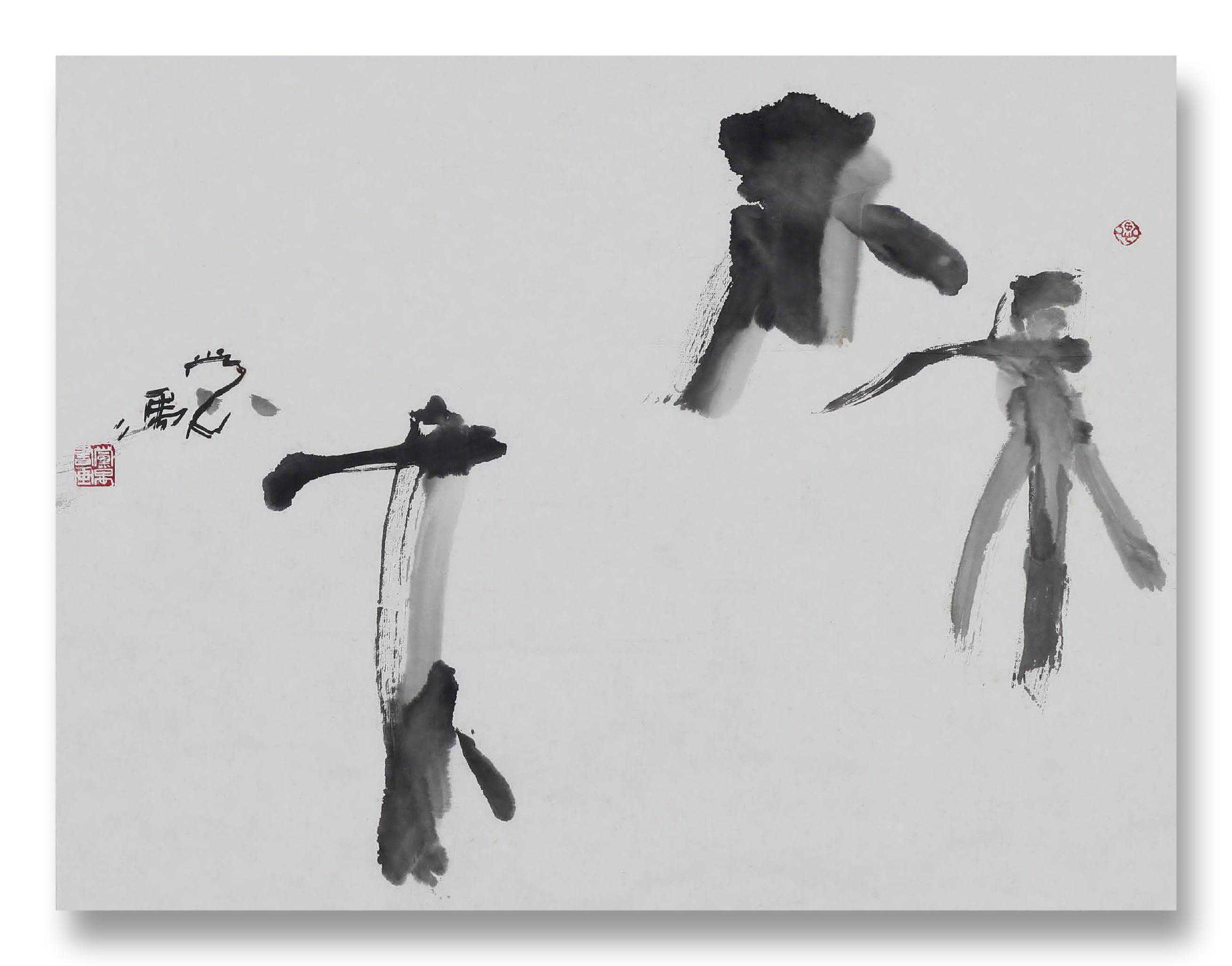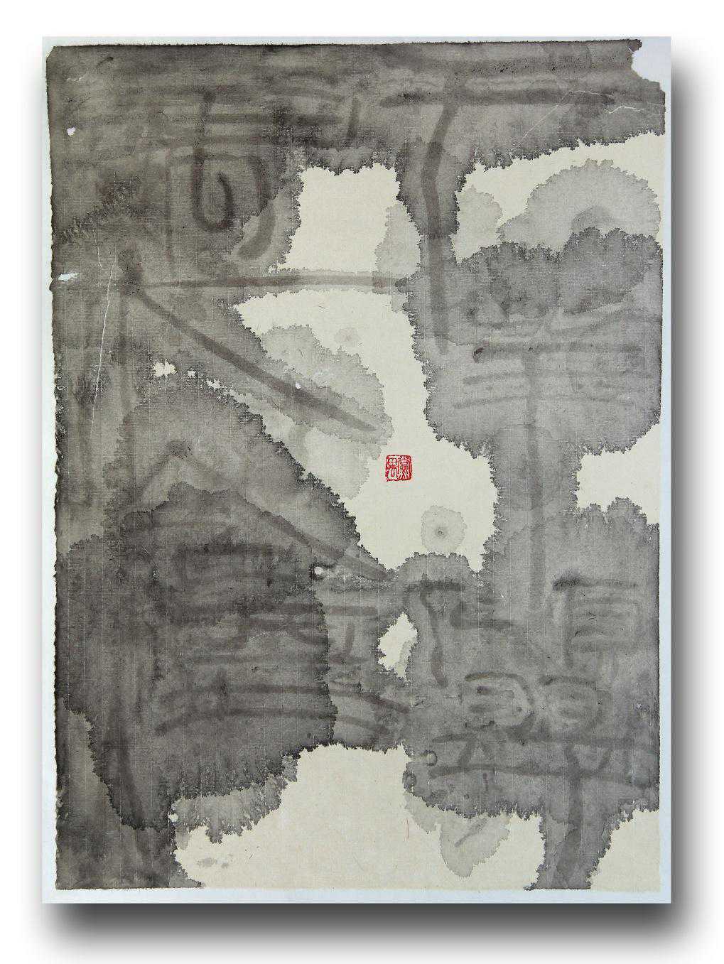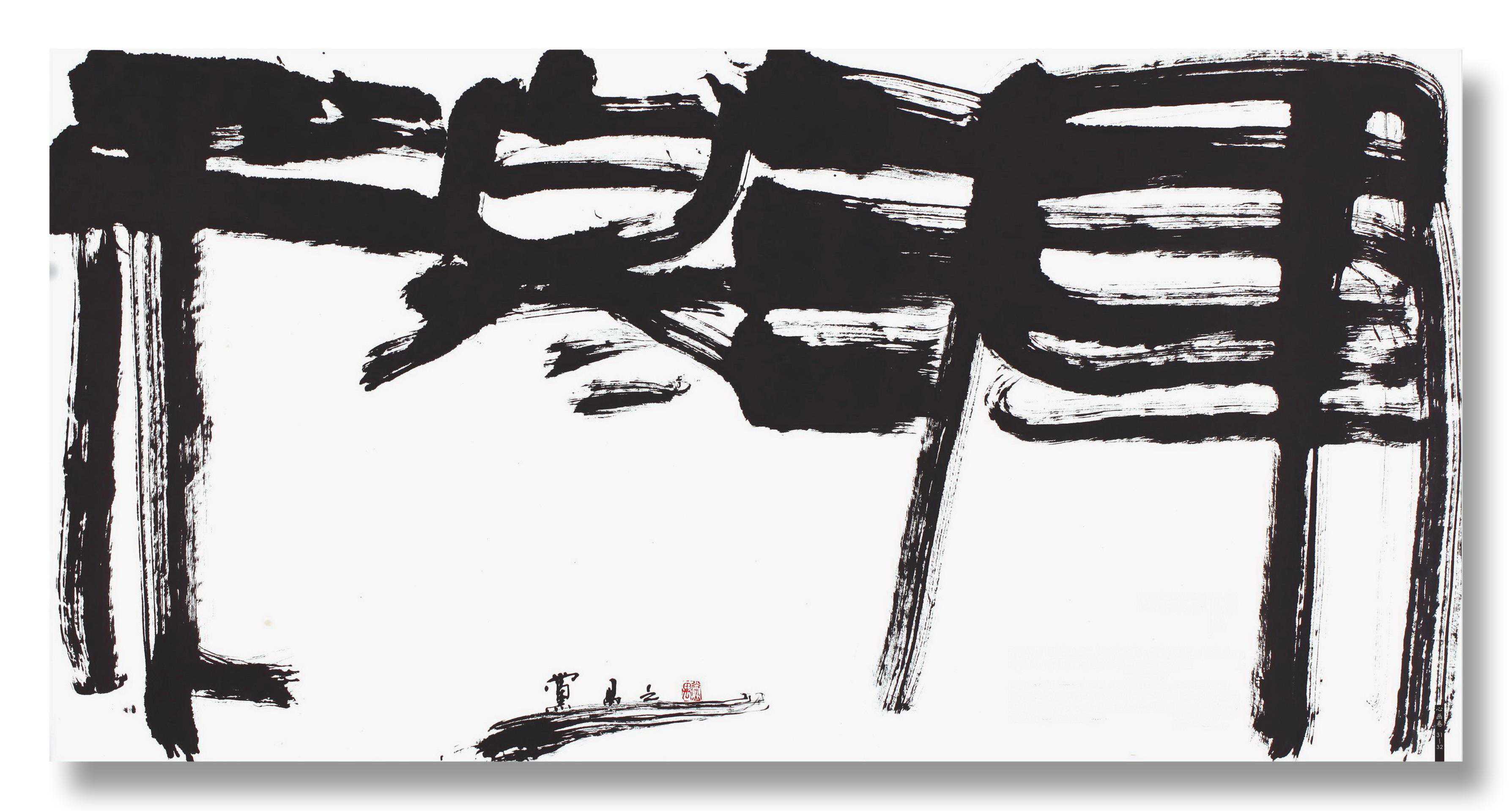 在这里他以书写为骨,泼墨为肉,在不经意间幻化出一幅亦书亦画的奇境。它似乎是湿漉漉的雨后荷塘,又像是芒鞋破帽持伞而舞的济颠,或是手拿芭蕉扇的八戒。那笔的枯涩继续,墨的浓淡肌理,空间的疏密聚散,充分展示了写意水墨的生动气韵。