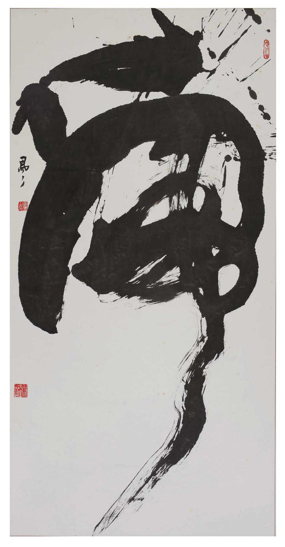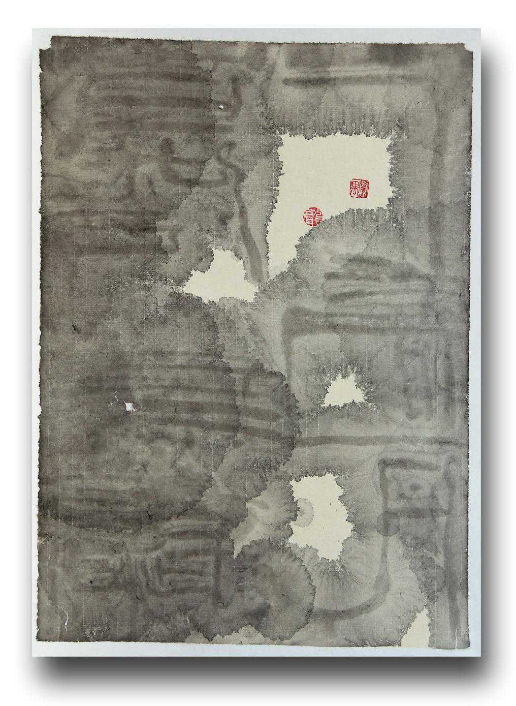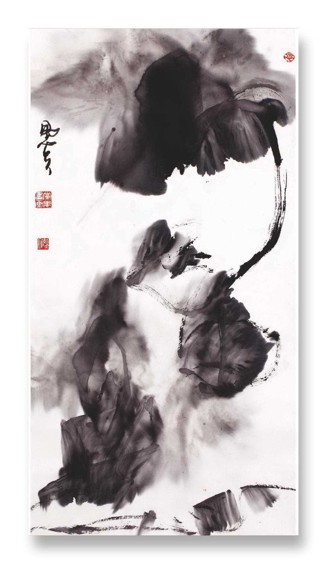 在这里他以书写为骨,泼墨为肉,在不经意间幻化出一幅亦书亦画的奇境。它似乎是湿漉漉的雨后荷塘,又像是芒鞋破帽持伞而舞的济颠,或是手拿芭蕉扇的八戒。那笔的枯涩继续,墨的浓淡肌理,空间的疏密聚散,充分展示了写意水墨的生动气韵。