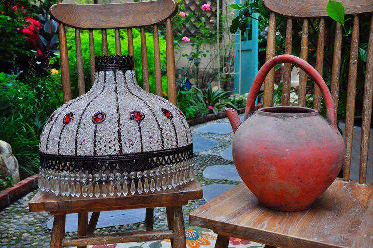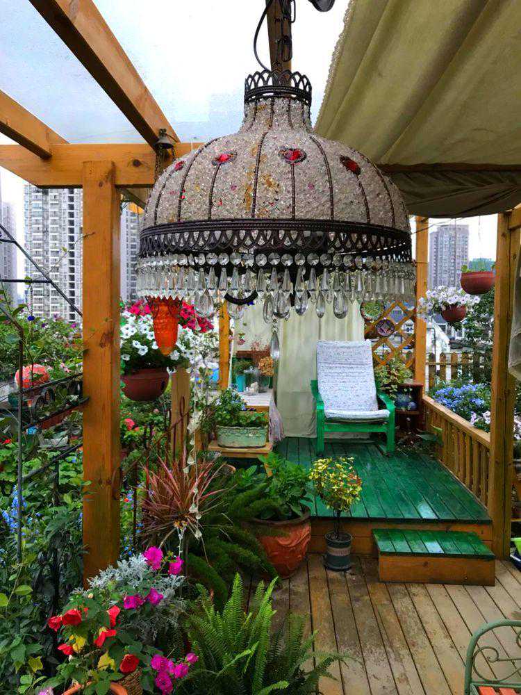 挂上洗干净淘回来的水晶灯搭,配着花园里各种花卉,怎一个美字可以形容。