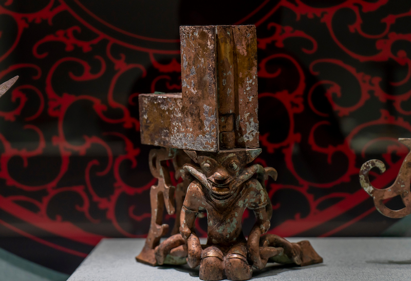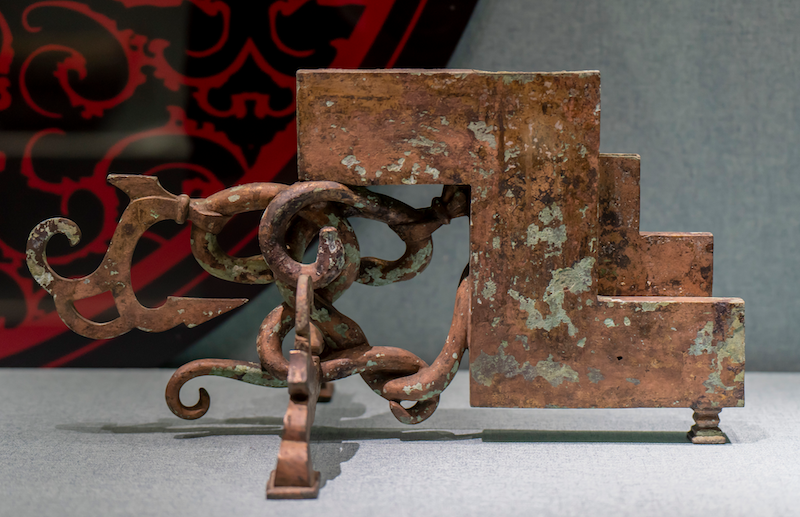 展览现场漆木屏风上限制出境的5件珍贵鎏金青铜构件之一