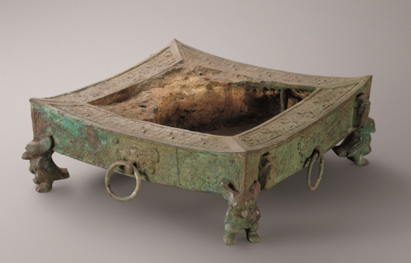 南越王墓中出土各式烧烤用具及4件大小不一的烤炉。这件方形铜烤炉,造型罕见,是极为珍贵的汉代烧烤实物,烤炉上的两对小猪造型是最早的烤乳猪实物形象。