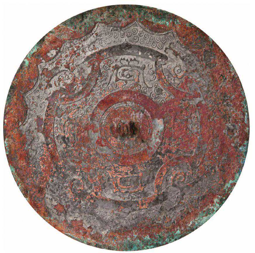 细三弦钮。此镜以细密的涡云纹为地,镜缘饰有19内向连弧纹,钮座外由凹面扁状带环绕成对称的方花纹,叶内各饰有玄鸟,姿态相同、均单足伫立、昂首曲颈、双翼张开,羽尾上扬,似穿梭于云海之间。此镜主体纹饰造型颇为抽象,但生动有趣,装饰层次丰富多样。