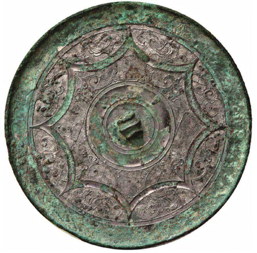 细三弦钮。钮座为四叶形且勾勒边线,加饰4圆、4水滴形装饰。镜缘饰有13内向连弧纹,主体纹饰为3只凤鸟,凤首居中、圆目勾啄、一足伫立,身体呈漩涡状弯卷,羽翼点缀其中,饶有趣味。地纹较为繁复。此镜凤纹造型简约、纤细、流畅,与繁缛的地纹形成鲜明对比,且四叶形钮座在同期铜镜中应属罕见。数字13为直接素数,不能尺规绘制。
