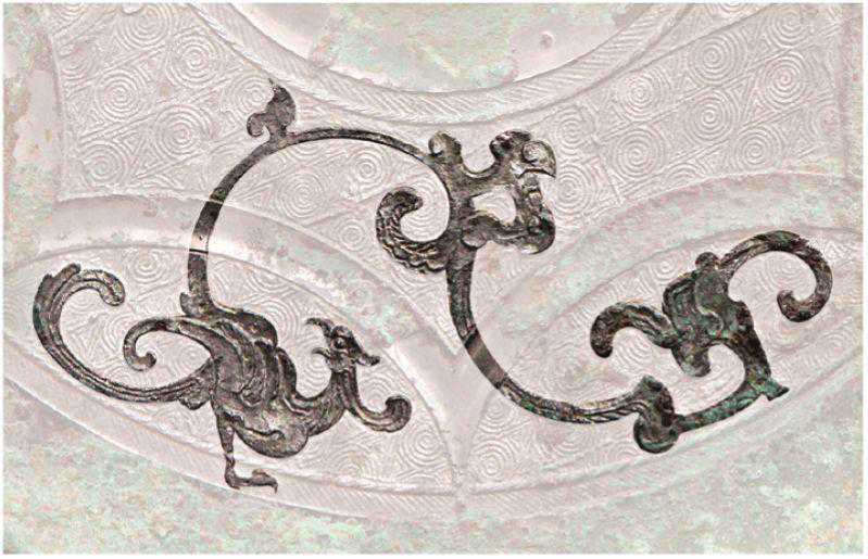 春秋战国时期,铜镜上的凤鸟纹常与云雷纹搭配形成云凤纹,可谓是现实与神话的糅杂。它依云纹弧度的某一局部,分别添加凤鸟的头、羽、足、尾。观之凤似穿梭其间,霎时云雾奔腾、凤舞九天,呈现出一种自由与欢快之态,好一幅仙境般的动人情景。S形凤鸟纹也是此时最为流行的一种装饰图案,S形的线条展示出对比与统一,且流动转换间,常与缠枝纹相配,展示出丰富多彩、生机勃勃之姿。除此之外,凤鸟纹也常以二方连续的样式出现,即一个或多个单位纹样,在平面上有规律地排列,或向上下及左右两个方向循环所构成的纹饰,故而显得颇为规整。而秦汉时期的凤纹图案,则更加多样化和具体化,常表现出对其外在形态的日趋写实,可谓实现了从抽象到具象的转换。