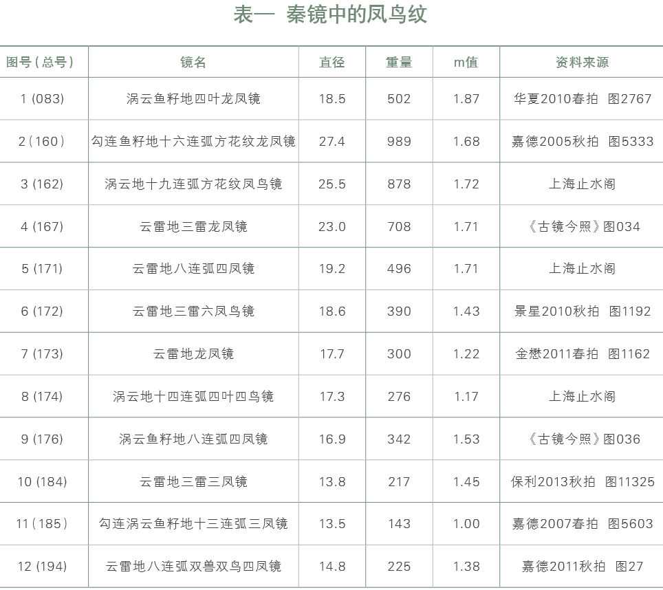 本文列举《秦镜文化研究》书中的镜例(见表一),皆为战国秦、秦朝的铜镜。依此12面铜镜样例,可一窥秦镜的特点,感受凤鸟纹在春秋战国与秦朝的铜镜中所展姿态,也可对当时青铜工艺的装饰艺术有所探微。