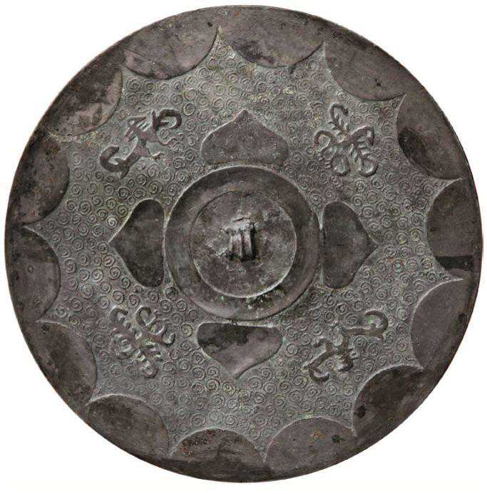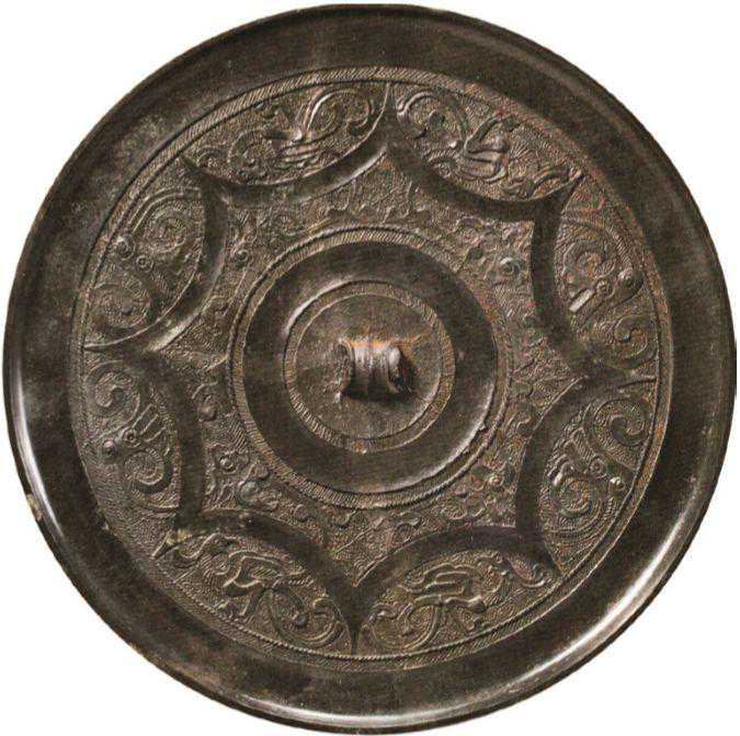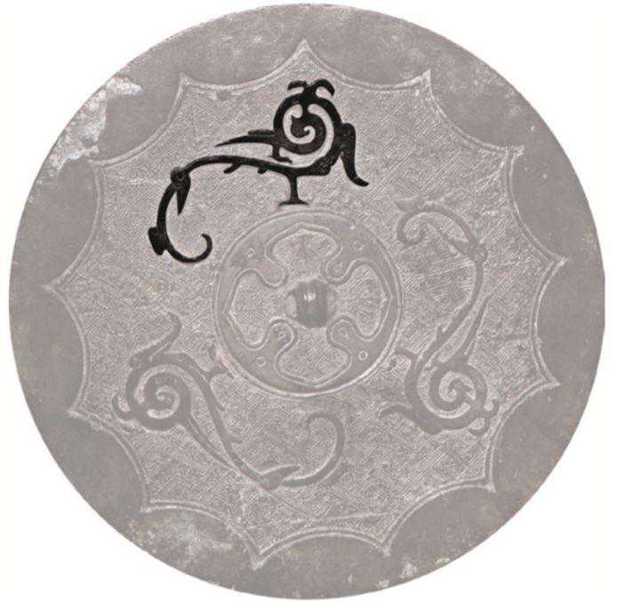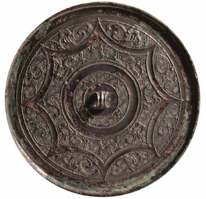 细三弦钮。钮座外凹面环带,内区饰有两圈斜线纹及绳纹,以纤细的涡云鱼籽纹为地,主体纹饰系内向8连弧,两弧内饰凤,凤冠上扬,顾盼回望,凤尾分为三叉,一叉自然卷曲与凤首呼应,一叉穿越连弧沿钮座外缘漫卷转向凤首,再穿越一连弧成花形尾饰。与图5相比,此图凤鸟有俯视之姿,单足弯曲,且羽尾弯曲的弧度与造型均有差别。在本书下册图录篇的216幅图中,仅图5与此图属同类,颇为罕见。
