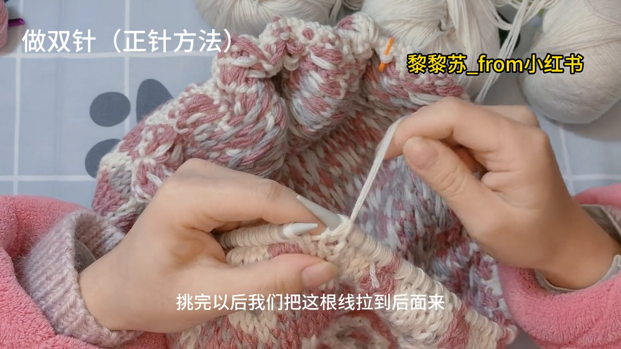 →挑完以后把这根线拉到后面来,然后继续织后面的针,织正针。看到了吗?这里原本的一针变成了一个交叉的两针,它就很容易被识别出来,就不需要再用新的记号扣了。