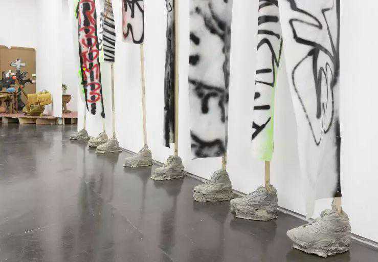 你看这个鞋的摆放就像我们在路边有时会看到的,为了固定遮阳的大伞或者旗子所使用的水泥墩子。我做了一些球鞋的模具里面可以灌上水泥,在里面水泥还没有干的时候就可以插一根棍子,做成举着类似品牌标志旗帜旗杆一样的感觉。