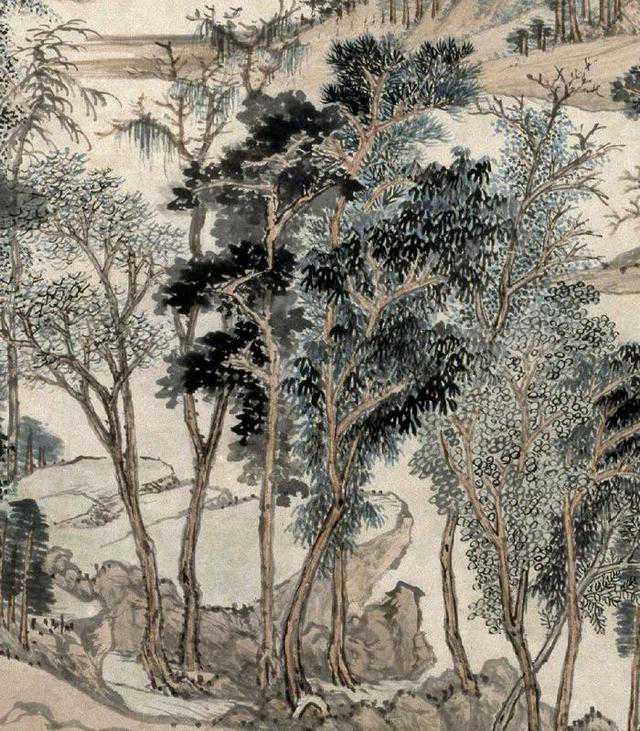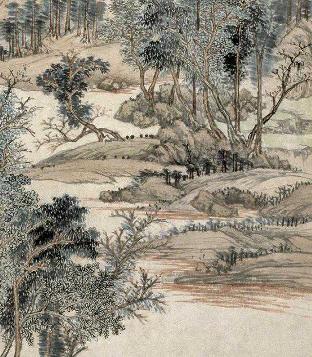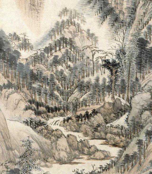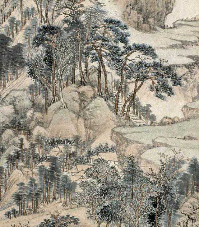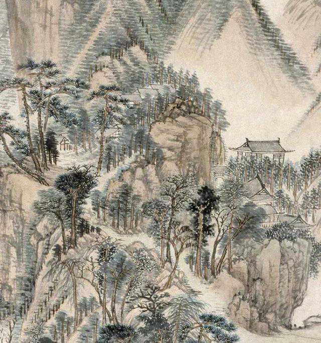 图绘群山巍峨、叠嶂攀升、峡谷溪涧曲转迂回之景,山腰处的古刹及林谷间隐现的屋舍均表明此山此景是士人希冀向往的隐居之所。全幅为高远式构图,重点描绘了中远之景。其景致充盈,繁而不乱,令人有望之所见、遐所不见之思。图中的物象被施以各种技法加以表现,山石以短线条皴擦,山脊以落茄点横向点染,苔草以焦墨擢点,醒目灵动。树叶以墨晕、双圈设色逸笔绘出。全图以青、绿、赭石兼墨色皴擦渲染,使山林呈现郁郁明净之气,既得黄公望画格的精髓,又有超逸之趣。