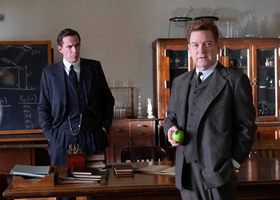 而影片最后,爱因斯坦和奥本海默见面时,则是一个法式松弛,一个英式端着,相映成趣↓