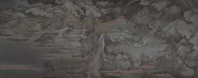 举个例子,他目前在高古轩举办的展览的核心部分是一幅32英尺长的全景丝绸卷轴,名为《溪山无尽》(2017)。从右向左移动,绘画的图像从细致的形象转变为抽象绘画——这是一种正式的演变,反映了艺术史上更广泛的变化。枯树和断裂的山脊变换成几何形状;以16世纪中国艺术家和理论家董启昌为代表的那些荒芜景观转变为致敬布拉克和毕加索的立体派形态。