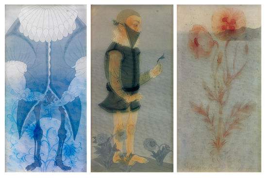 在画廊的其他位置,两幅画——一幅双联画和一幅三联画——从不同的角度以不同的方式探讨同样的一个主题——这是中国文人画中一种常见的表现形式。受到19世纪中国艺术家王子若砚匾的启发,《夜以继日》(2017-18)以较大篇幅的画布想象白天的场景,每个细节都清晰可见;而以较小的画作部分描绘夜晚——这是一种先兆般的炭黑视觉。
