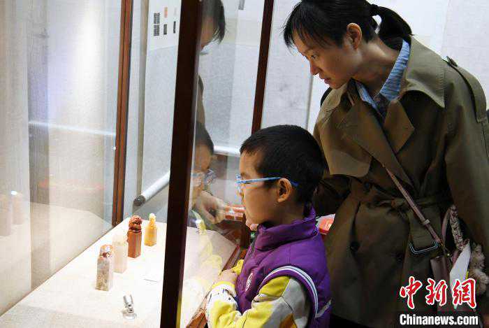 观众观看福建省第三届篆刻艺术展暨寿山石印钮雕刻邀请展。中新网记者刘可耕摄