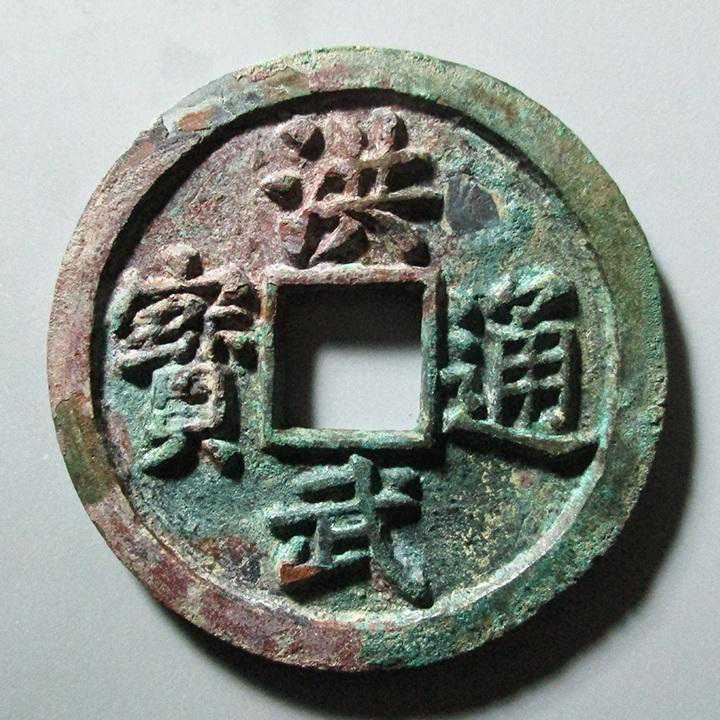 洪武元年(1368年)正月,朱元璋称帝,建立明朝,改元“洪武”,同年三月,开铸洪武通宝钱。明代钱文不称元宝,因为朱元璋的名字中有“元”字,要避讳,而且又要避讳元朝的“元”字,把所铸钱文一律叫通宝而不叫元宝,而不只是为避讳他自己的名字,所以自大中到永历,不论大小,都称通宝。